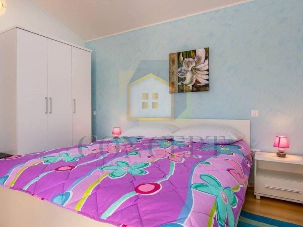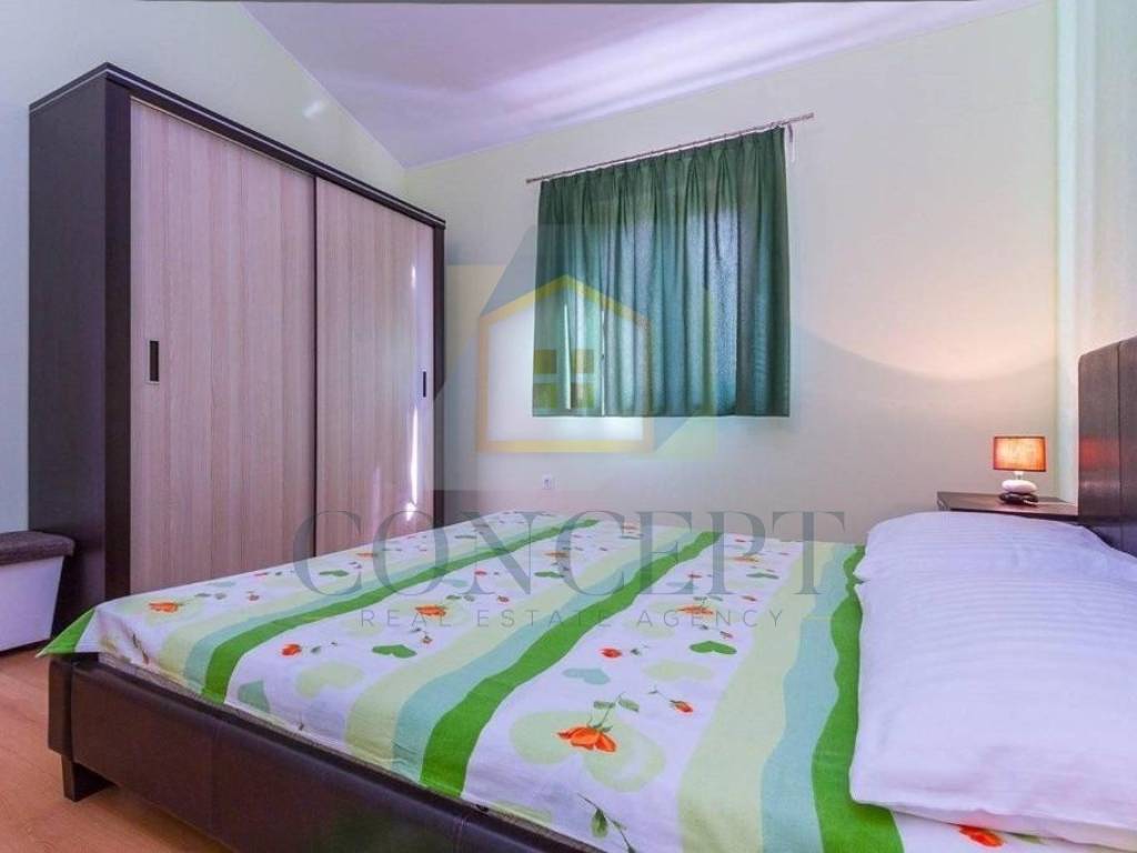 Kuća se proteže na dvije etaže. U prizemlju se nalazi spavaća soba, kupaonica, dnevni boravak te kuhinja s blagovaonicom po open space konceptu, s izlazom na prostranu natkrivenu terasu na kojoj je smješten kamin za roštilj.
