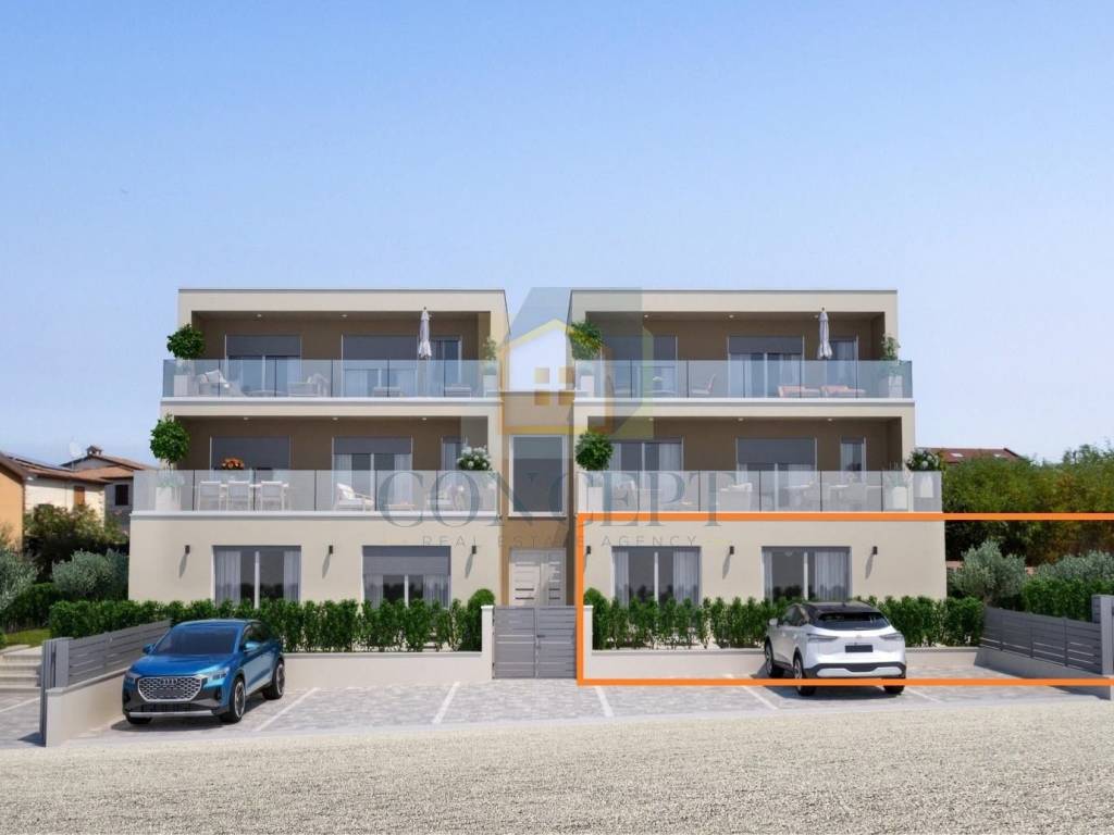 Na mirnoj lokaciji udaljenoj svega 7 km od Poreča i mora prodaje se stan u prizemlju zgrade koja je u izgradnji, a koja će se sastojati od ukupno četiri stambene jedinice.