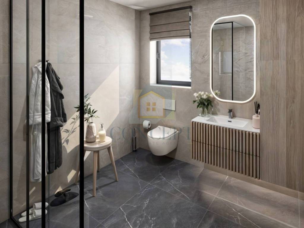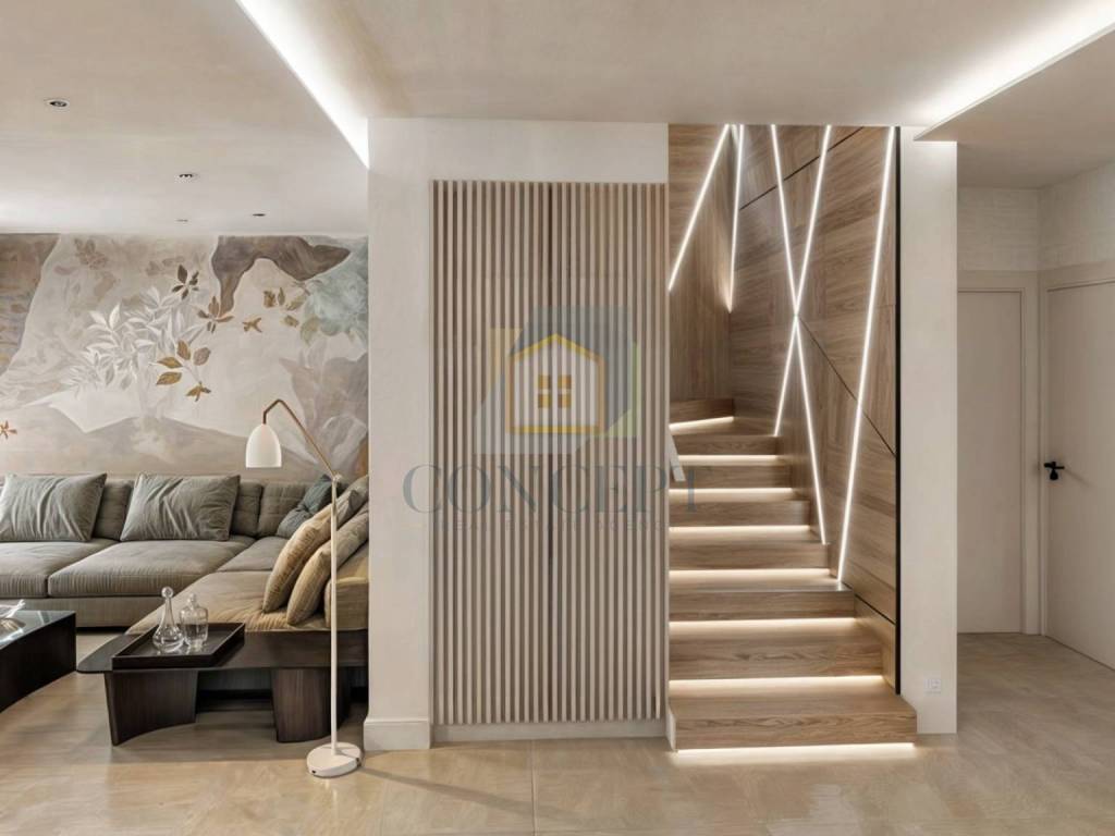 U prizemlju će se nalaziti dnevni prostor otvorenog koncepta s kuhinjom, blagovaonicom i dnevnim boravkom, iz kojeg će se izlaziti na natkrivenu terasu površine 18 m. Na ovoj etaži bit će smješteni i toalet te tehnička soba/spremište. Terasa će voditi prema uređenom dvorištu u kojem je predviđen bazen površine 28 m sa sunčalištem.