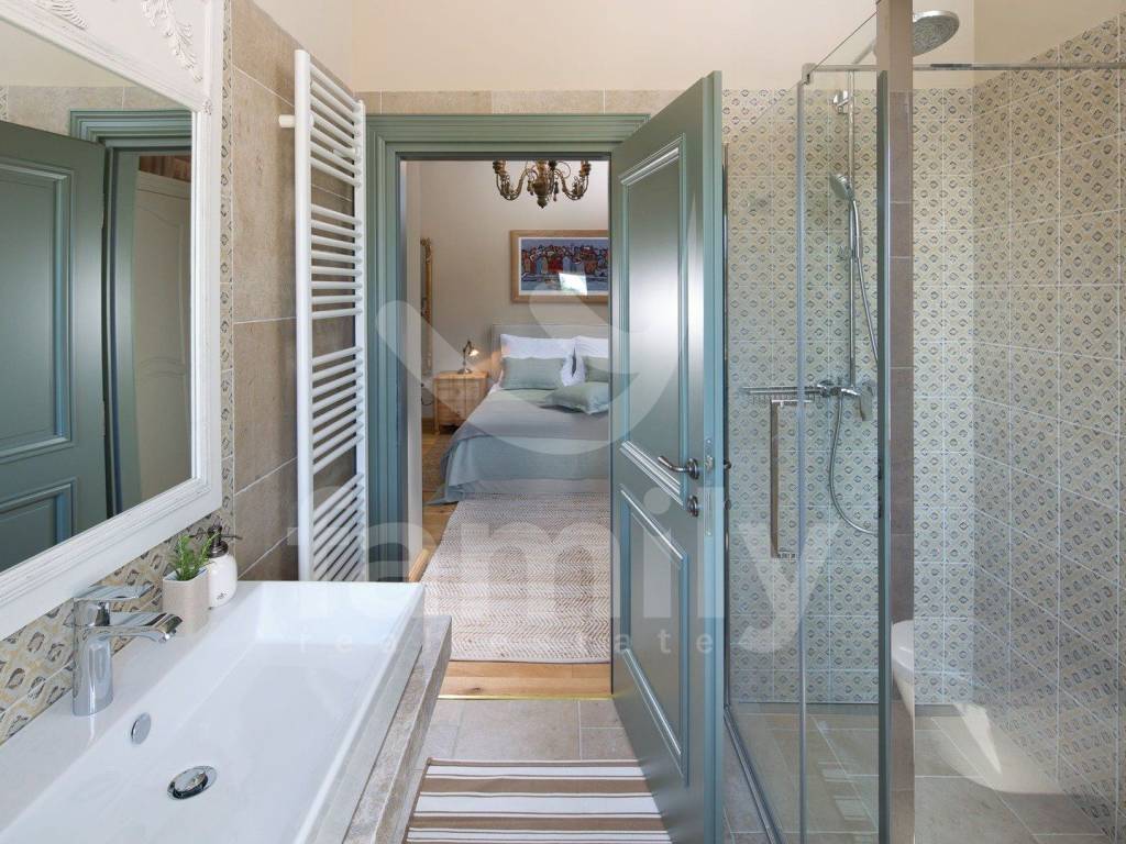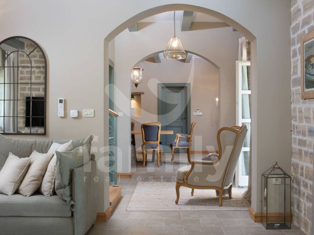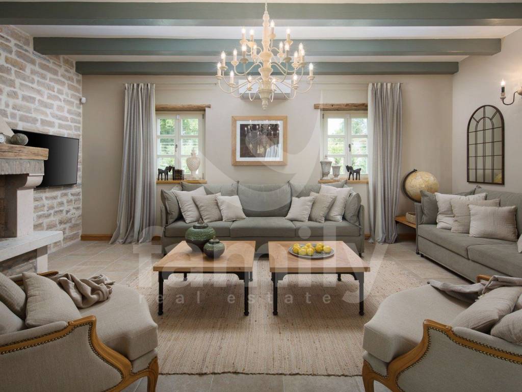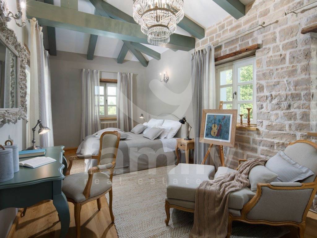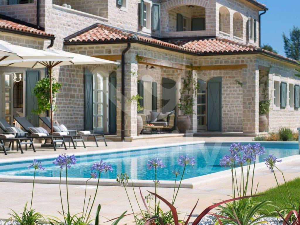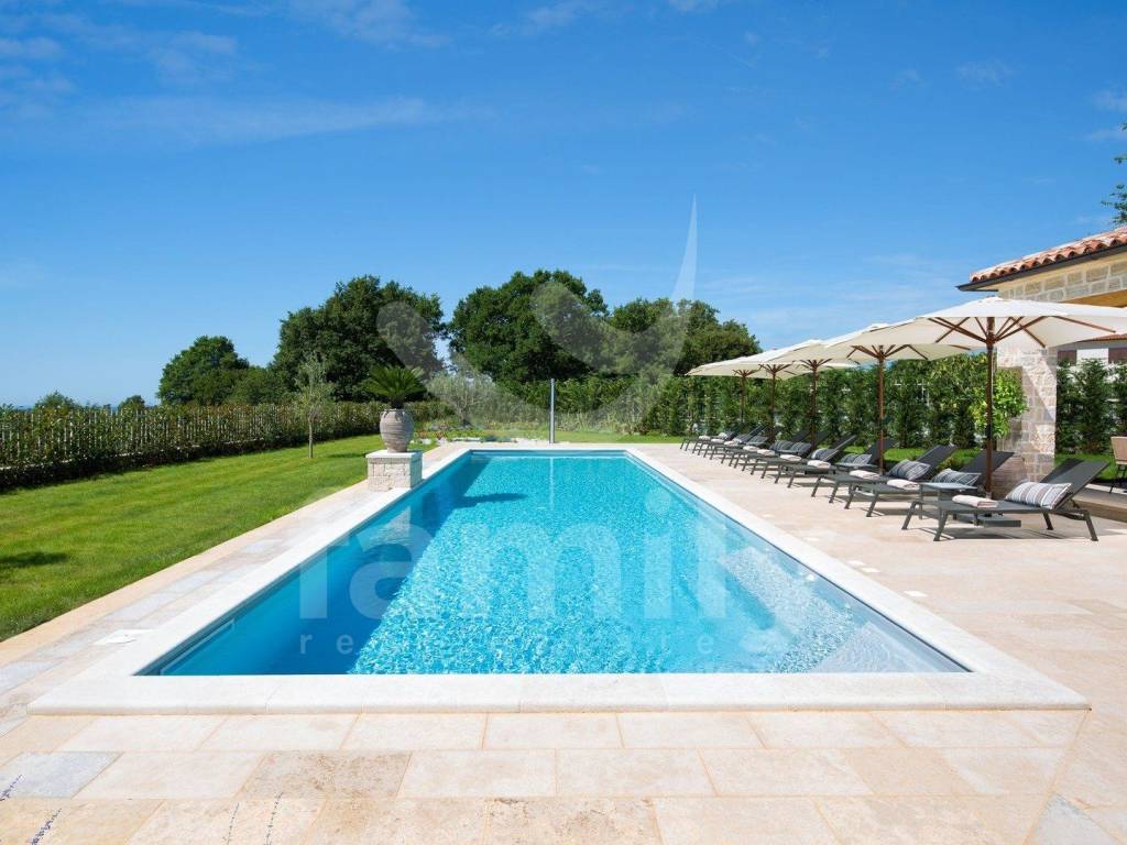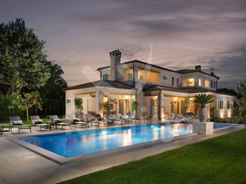 Nedaleko od Kanfanara, u manjem naselju smještena je ova predivna i raskošna villa površine 372 m2 sa okućnicom površine 1611 m2. Vila se prostire na dvije etaže, prizemlje i prvi kat. U prizemlju se nalazi izuzetno prostrani dnevni boravak sa kaminom, blagovaonica za velik broj gostiju, rustikalno i moderno kompletno opremljena kuhinja, dvije spavaće sobe sa privatnim kupaonicama, dok se na prvome katu nalaze još tri spavaće sobe svaka sa svojom kupaonicom od kojih dvije imaju izlaz na terasu sa kojih se prostire prelijepi pogled na more i Rovinj. Okućnica je imponzantna te se na njoj nalazi bazen površine 67 m2, sunčalište, ljetna kuhinja, kupaonica, solarni tuš i pregršt parkirnih mjesta. Pored svega navedenog u sklopu nekretnine i u suvlasništvu nalaze se sportski tereni za rukomet, košarku i nogomet, teren za odbojku, dva teniska terena, boćalište, fitness na otvorenom, dječje igralište, a tu se nalazi i eko povrtnjak sa svežim eko namirnicama.