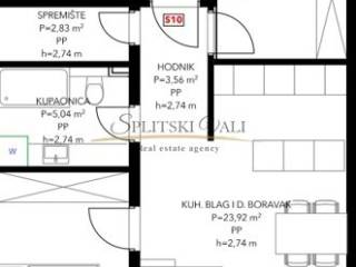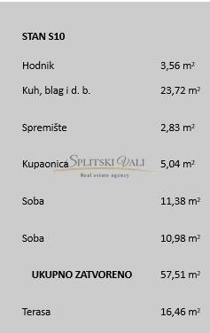 Stan oznake S10 sastoji se od ulaznog hodnika s garderobom, prostranog dnevnog boravka open space kocept s blagovaonicom i kuhinjom, dvije spavaće sobe, kupaonice,spreme i terase s izlazom iz dnevnog dijela. S terase se pruža pogled na more.