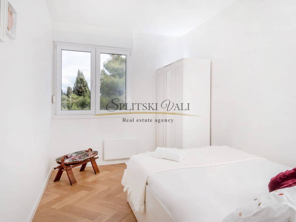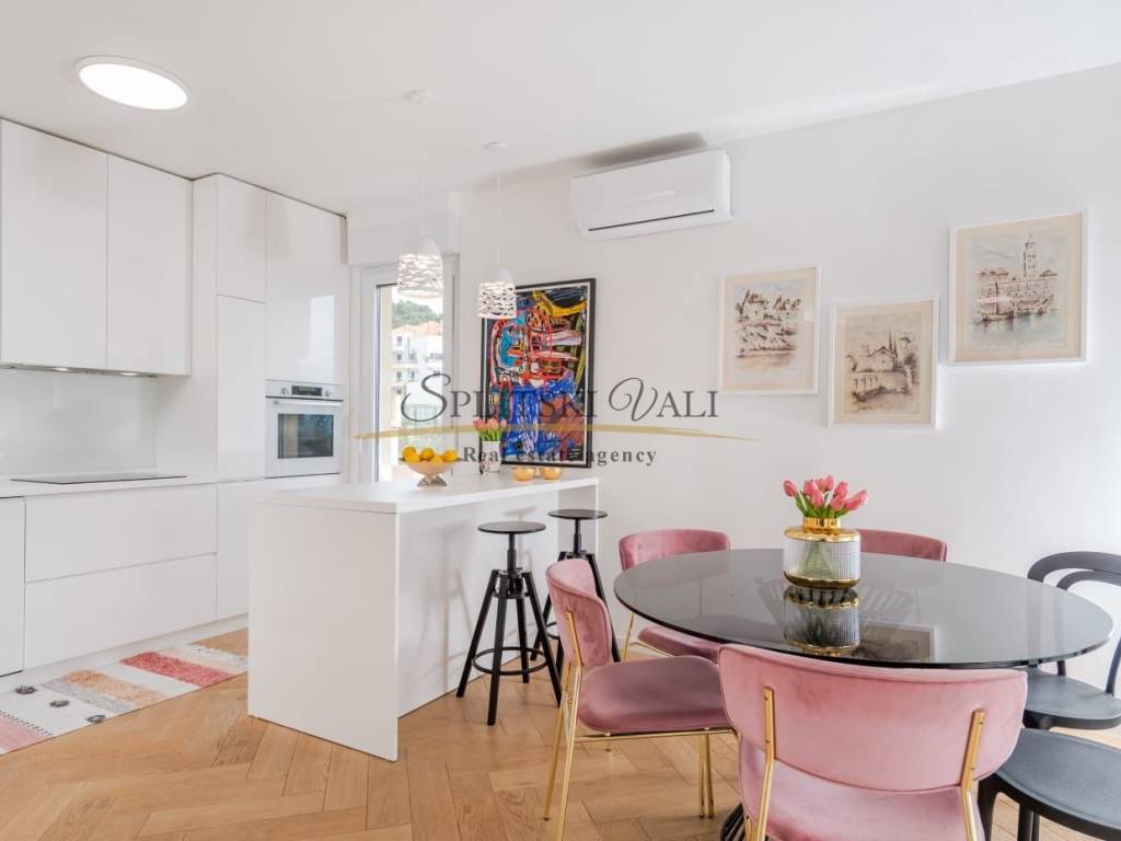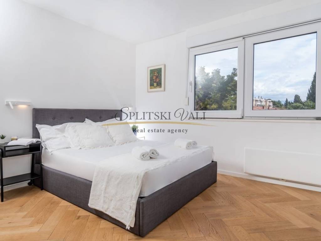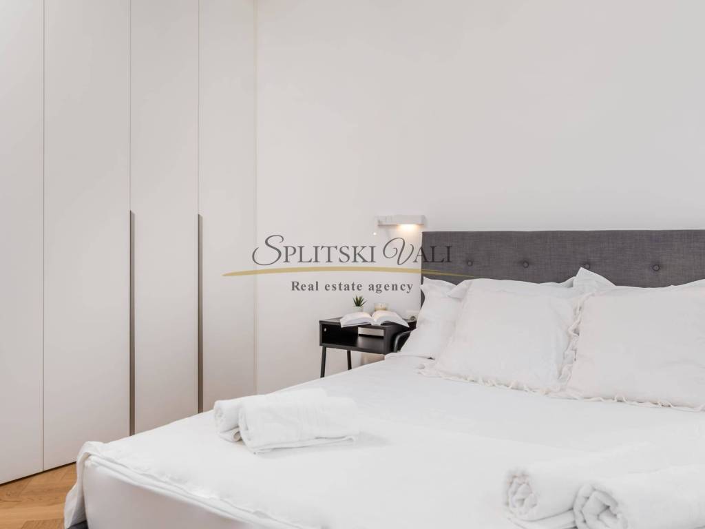 Posredujemo u najmu luksuznog dvosobnog stana na odličnoj lokaciji u Splitu - predio Meje. Osim dvije spavaće sobe, stan se sastoji od kuhinje s blagovaonicom, dnevne sobe, kupatila, hodnika i balkona s prekrasnim panoramskim pogledom na more. Stan je južne orijentacije te je iznimno svijetao i osunčan.