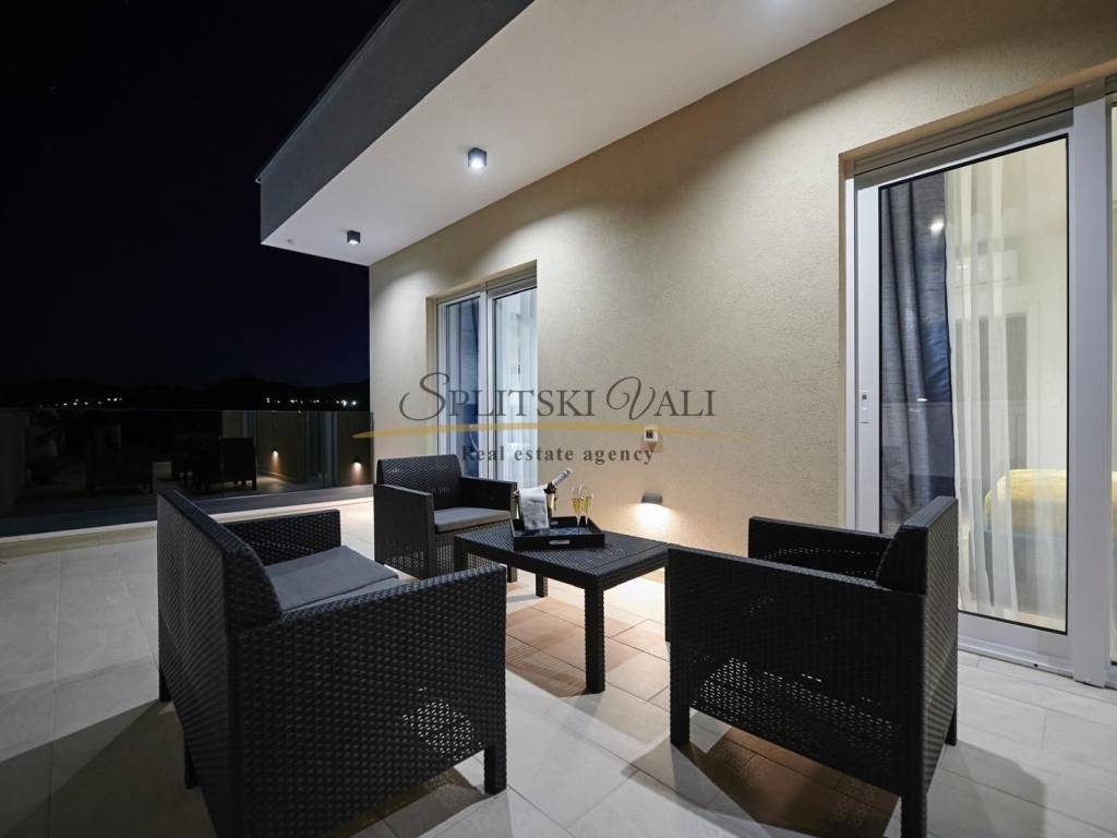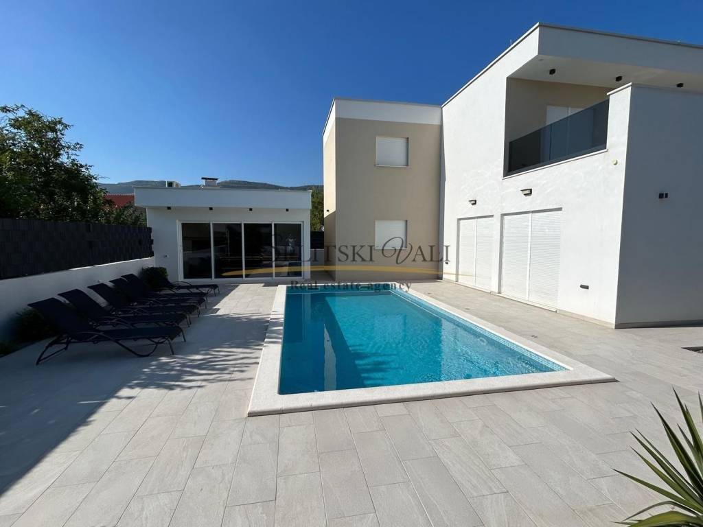 Posredujemo u prodaji prekrasne vile u Kaštel Novom. Ova luksuzna nekretnina, sagrađena 2020-e godine od najkvalitetnijih materijala, prostire se na dvije etaže ukupnih 200 m2 s okućnicom od 300 m2. Osim četiri spavaće sobe, vila sadrži tri kupatila, open space dnevne sobe s kuhinjom i blagovaonicom te direktnim izlazom u vrt, dvije ostave, prostranog hodnika, komforne terase te dodatnog objekta površine 35 m2 koji se nalazi neposredno uz popločani dio vrta s velikim bazenom. Prodaje se potpuno namještena. Vila ima parking za nekoliko vozila. Za razgled i dodatne informacije ljubazno Vas molimo da nazovete 0993202222 Antea.
