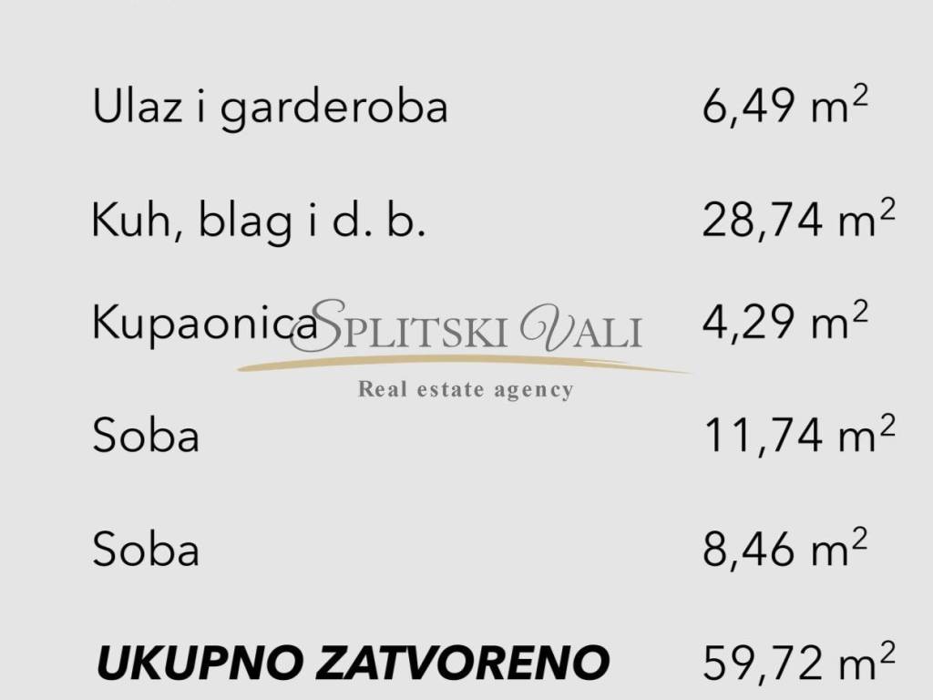 Prostire se na 59. 72 m2 zatvorene površine te 12,08 m2 terase. Ova nekretnina sastoji se od predsoblja, dvije spavaće sobe, kupatila, kuhinje s blagovaonicom, dnevne sobe te prostrane terase.