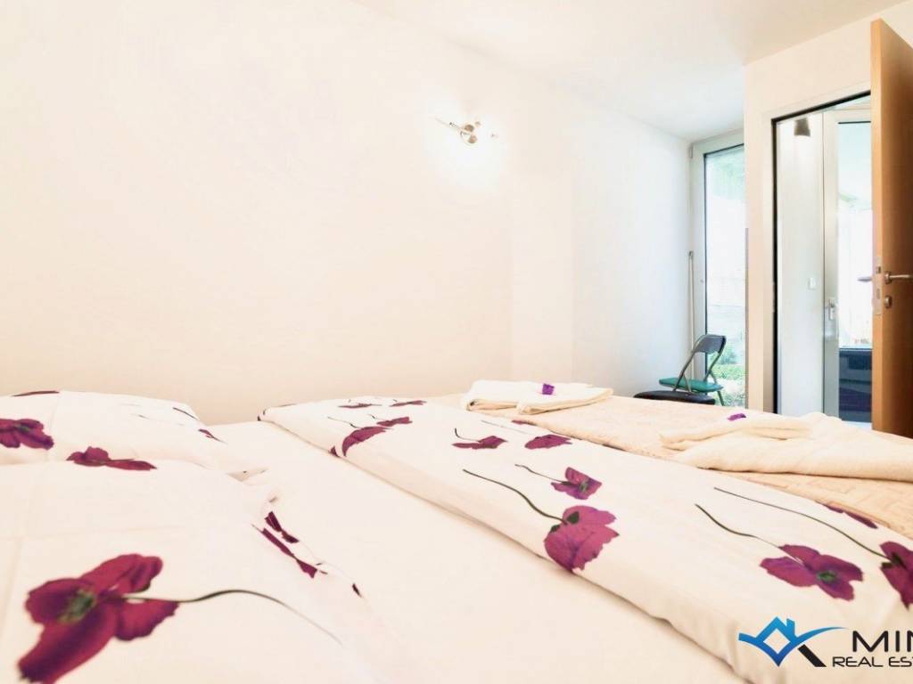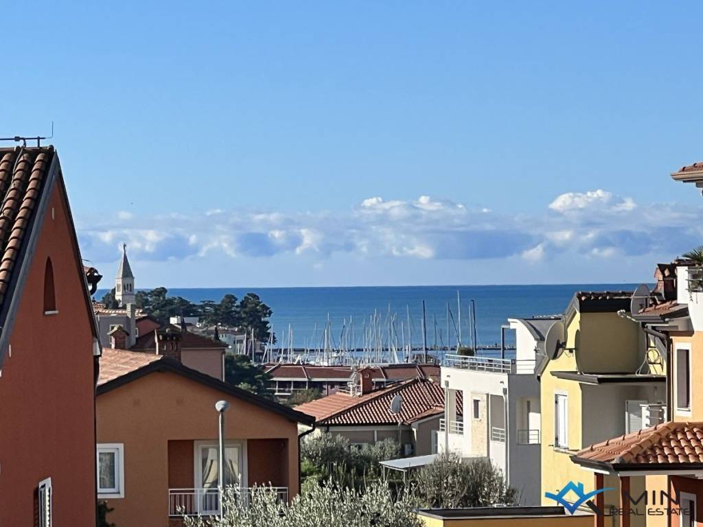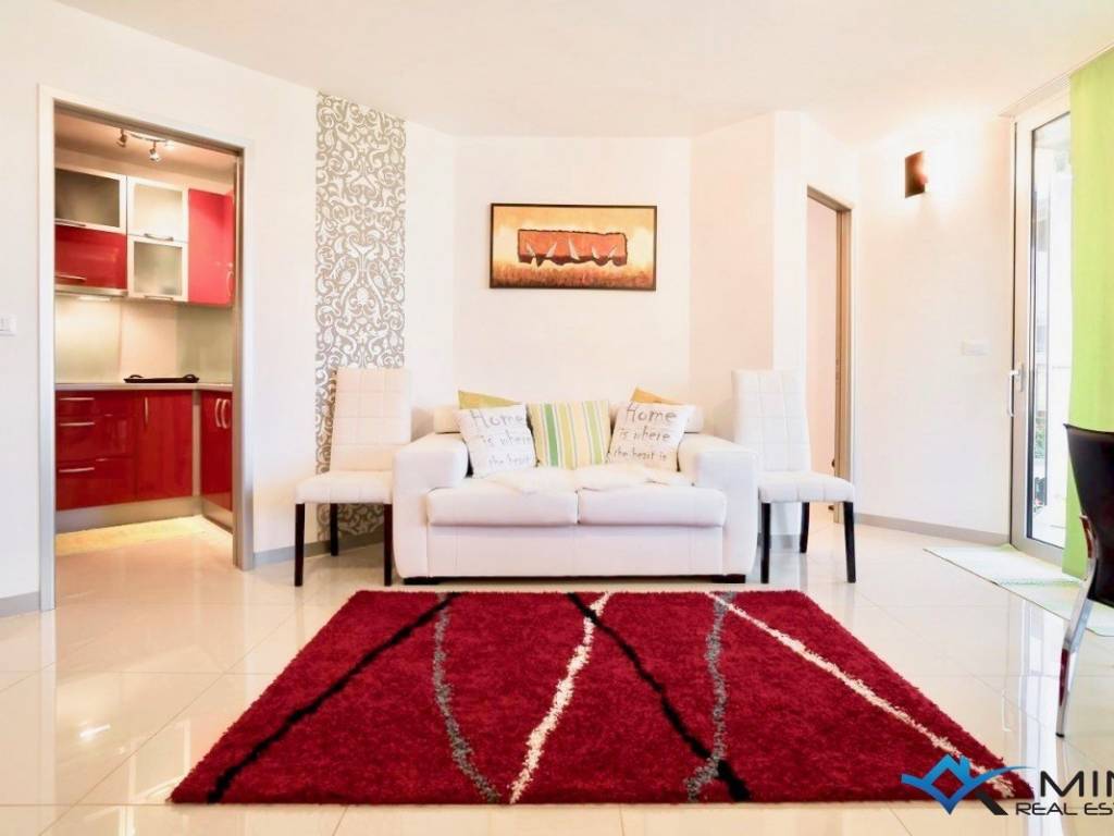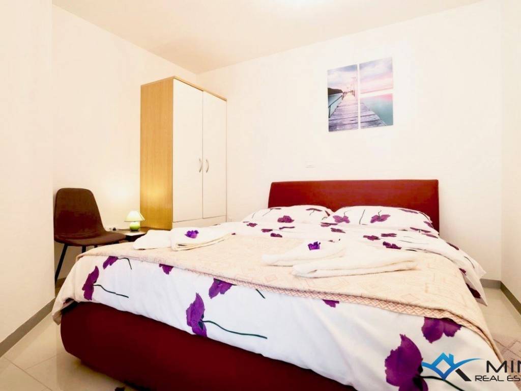 Prodaje se stan udaljen 1100 m od centra grada te 900 m od mora i lijepo uređene plaže. Stan se nalazi na mirnoj lokaciji te je smješten na 1. katu zgrade s liftom. Stan ima 61, 75 m2 + 8,46 m2 parking u garaži te spremište. Stan se sastoji od ulaznog hodnika, kupatila, 2 spavaće sobe, kuhinje, blagovaonice te dnevnog boravka s izlazom na natkrivenu terasu s lijepim pogledom na more. Grijanje / hlađenje u stanu je putem podnog grijanja i klima uređaja. Stan je moguće koristiti u stambene ili turističke svrhe.