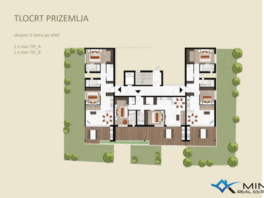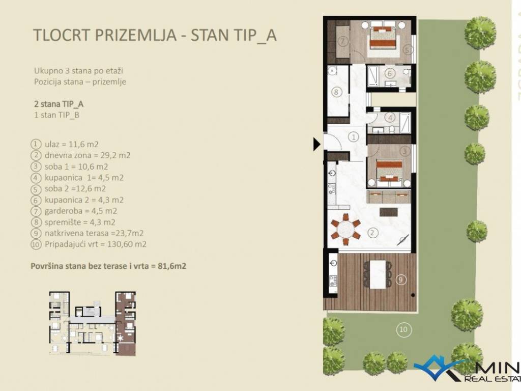 Na mirnoj lokaciji u Novigradu prodaje se luksuzan stan udaljen 900 m od mora i lijepo uređene plaže te 1200 m od centra grada. Stan je smješten u prizemlju zgrade koja je izgrađena visokokvalitetnim materijalima, a ukupno se u zgradi nalazi 8 stanova. Stan u prizemlju ima 115 m2 od kojih je 81, 60 m2 stambeni dio ( ulazni hodnik, spremište, garderoba, 2 kupatila, 2 spavaće sobe, kuhinja s blagovaonicom i dnevni boravak ). Stan ima vrt od 130 m2 ( neto 13 m2 ), natkrivena terasa 23, 70 m2 ( neto 11, 85 ), spremište 4, 70 m2 ( neto 3, 50 m2 ) i parkirno mjesto od 12, 50 m2 ( neto 2, 50 m2 ). Stan je opremljen električnim podnim grijanjem, klima uređajima te kaminom. Stan je opremljen keramikom 1. klase, a sanitarije u kupatilima su od poznatih proizvođača. Stan je moguće koristiti u stambene ili turističke svrhe.