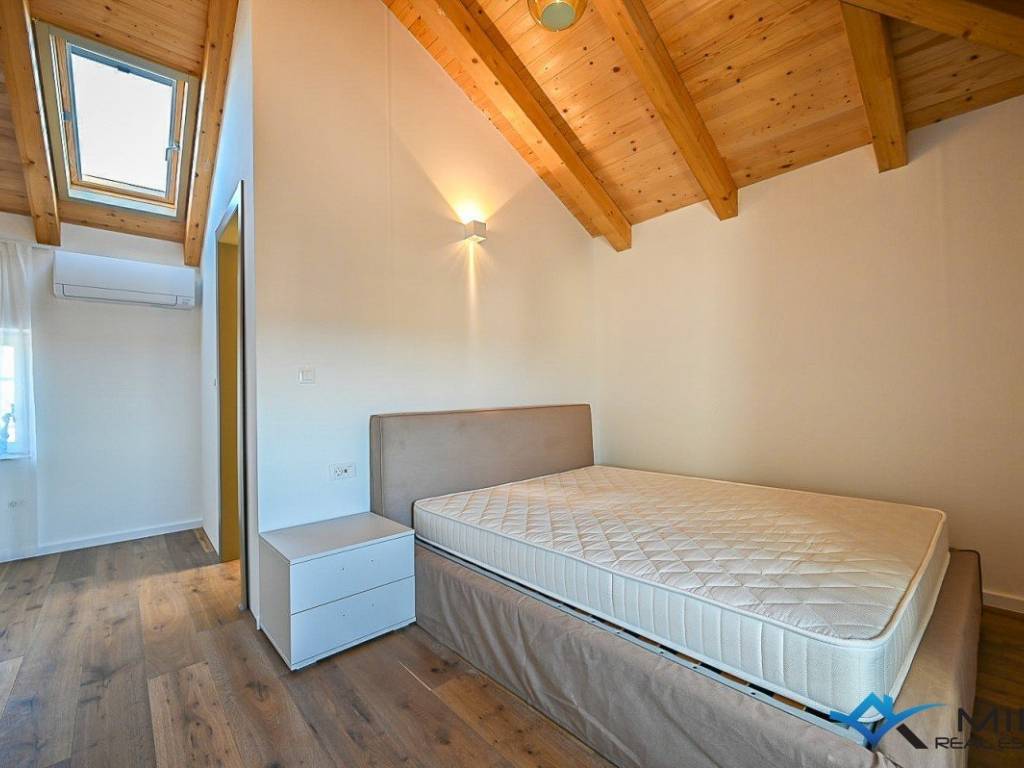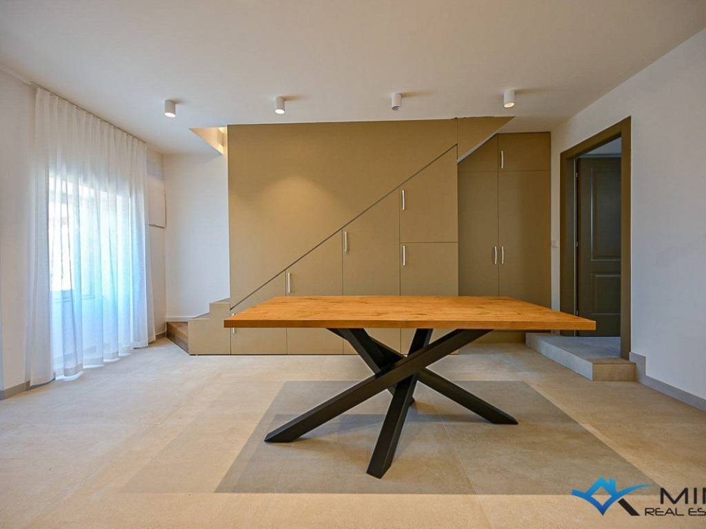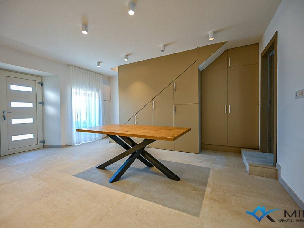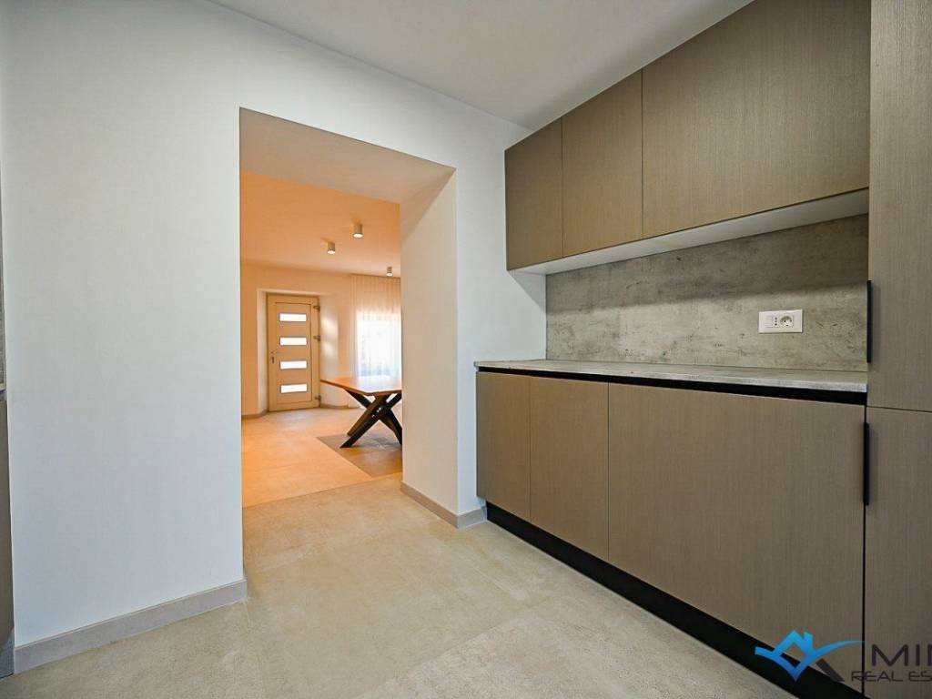 Prodaje se kuća u nizu na mirnoj lokaciji udaljena 3 km od mora i lijepo uređene plaže. Kuća ima 135 m2 i podijeljena je na 4 etaže. U prizemlju se sastoji od blagovaonice, kupatila i kuhinje s izlazom na vrt. Na 1. katu nalazi se dnevni boravak i komforna spavaća soba od 15 m2. Na 2. katu smještena je spavaća soba i kupatilo, dok se u potkrovlju nalazi 3. spavaća soba i kupatilo. Kuća je kompletno obnovljena te je opremljena talijanskim namještajem te se takva i prodaje.