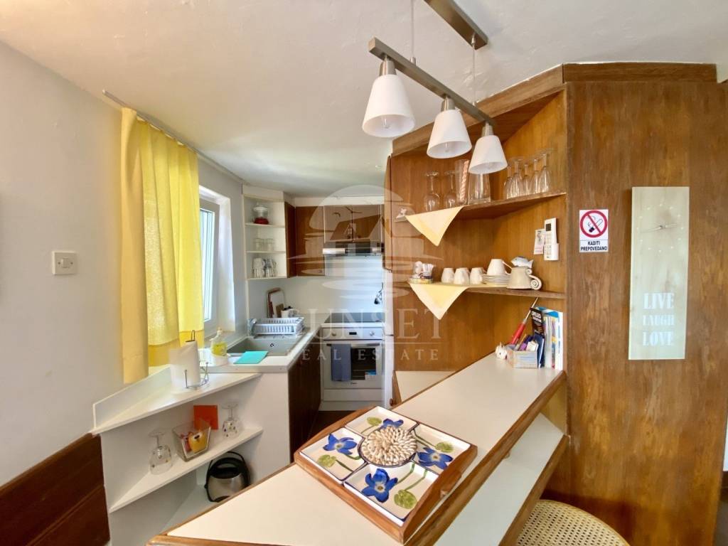 Na prodaju je kamena kuća na parceli od 230 m, smještena na mirnoj lokaciji, nedaleko od mora. Kuća se prostire na dvije etaže, ukupne površine 92 m, i sastoji se od prizemlja i prvog kata. U prizemlju se nalazi prostrani dnevni boravak spojen s kuhinjom i blagovaonicom po open space konceptu, te manja kupaonica.