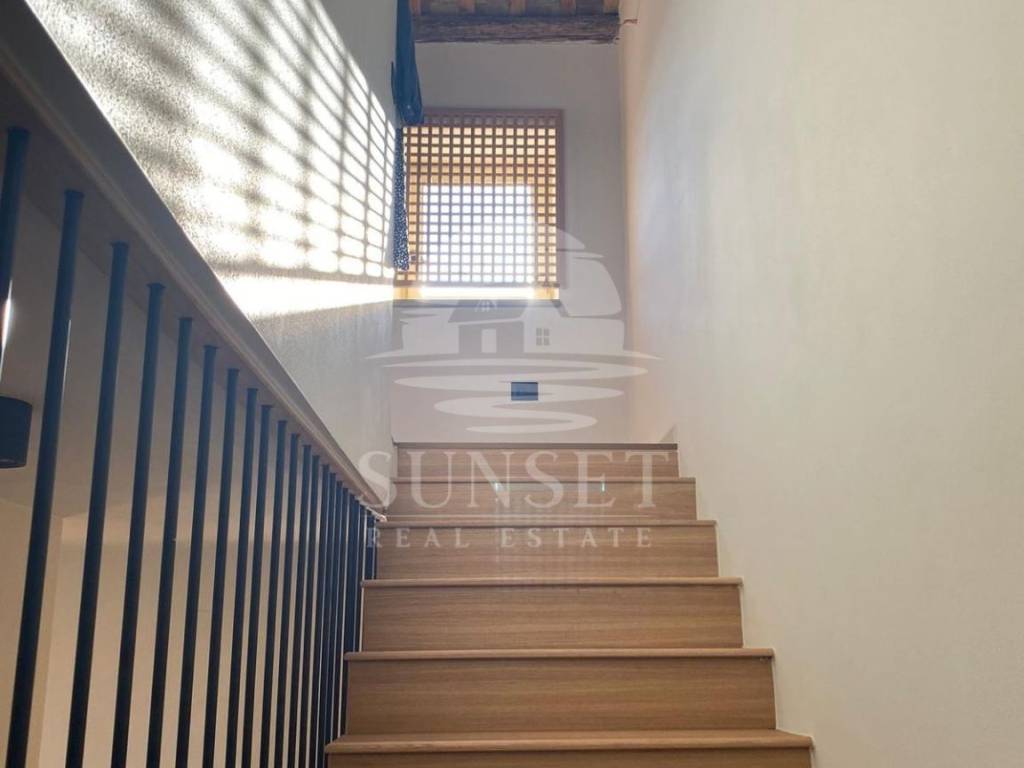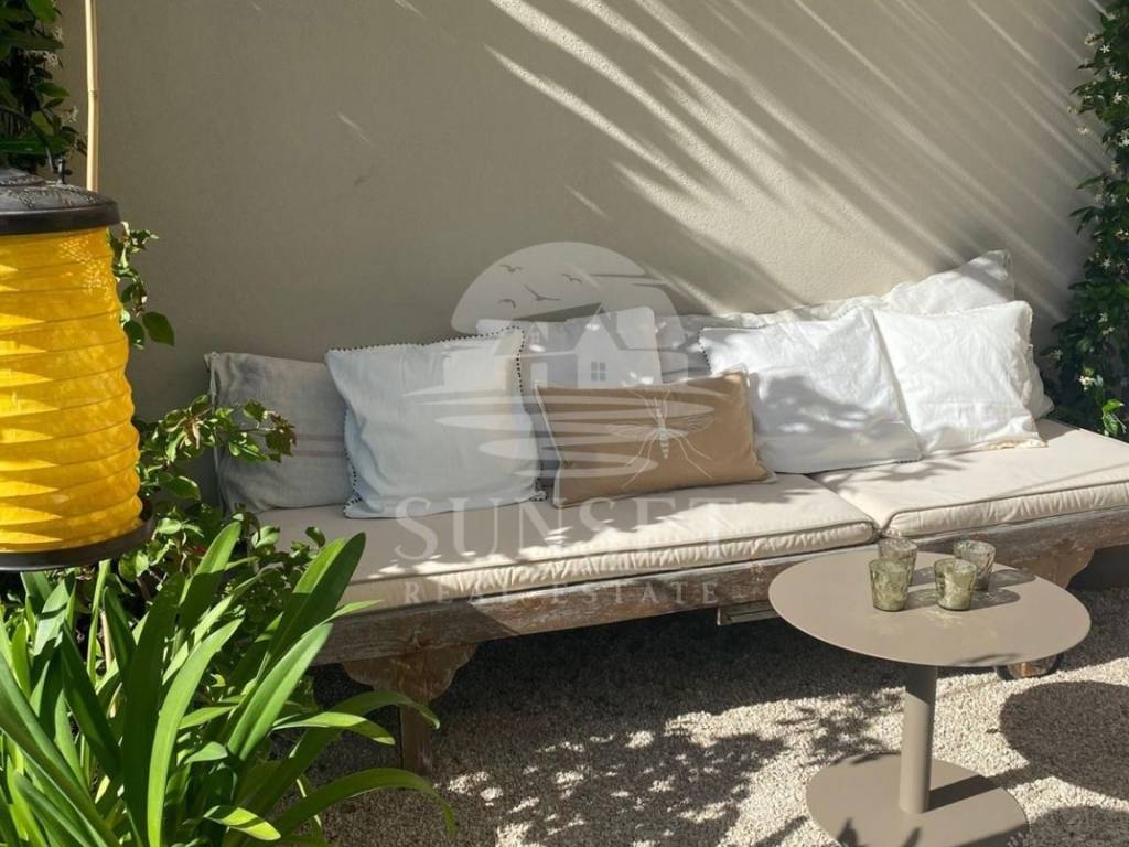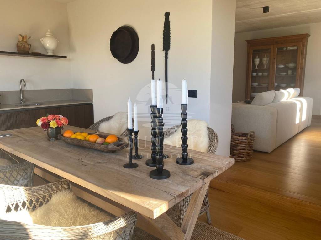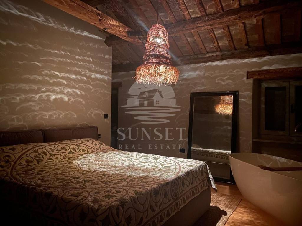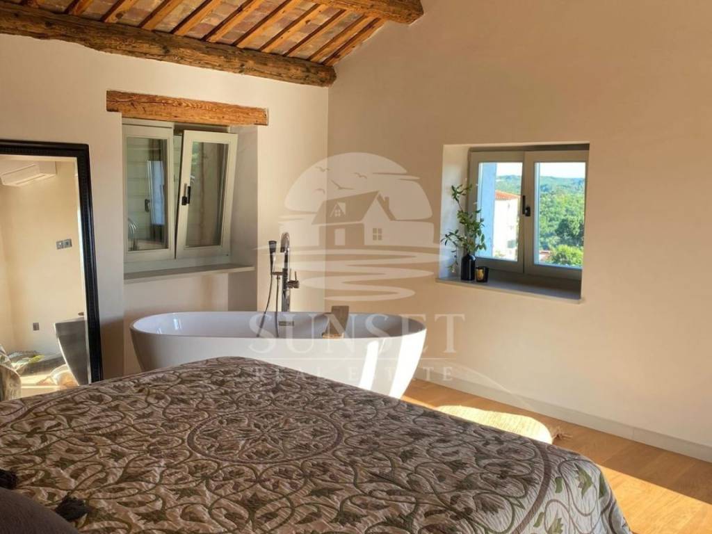 Ova prelijepa kuća proteže se na tri etaže: prizemlje, prvi kat i visoko potkrovlje, ukupne površine od 170m. U prizemlju se nalazi prostor otvorenog plana koji povezuje dnevni boravak, blagovaonicu i kuhinju, opremljenu vrhunskim materijalima iz Veneta Cucina, a izlaz iz tog prostora vodi u dvorište. U prizemlju se također nalazi gostinjski WC. Na prvom katu smještene su dvije spavaće sobe, svaka sa svojom vlastitom kupaonicom, dok se u visokom potkrovlju nalazi još jedna spavaća soba s privatnom kupaonicom i izlazom na prostranu terasu. Kuća je opremljena Mitsubishi klima uređajem za ugodnu temperaturu tijekom cijele godine, a kamin u dnevnoj sobi stvara dodatnu toplinu i ugodnu atmosferu.