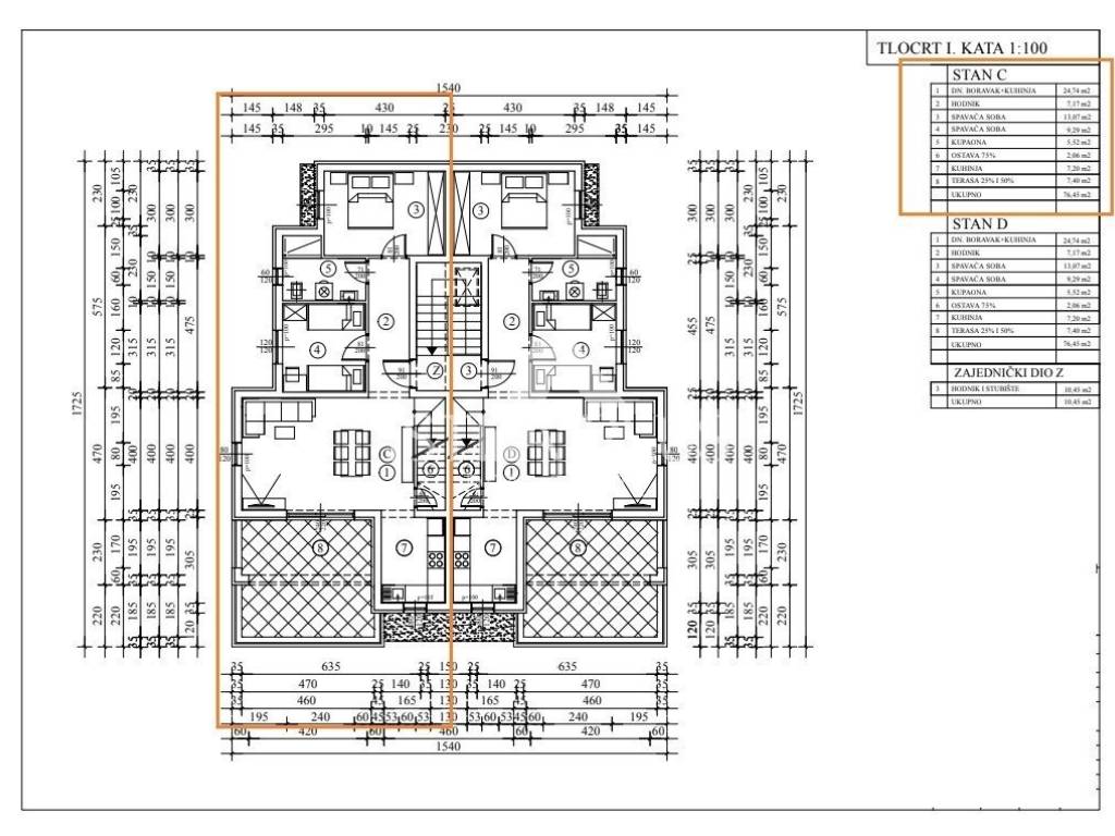 Stan se sastoji na prvoj etaži od hodnika, dvije spavaće sobe od kojih jedna ima terasu , kupaonice , dnevni boravak sa blago uvučenom kuhinjom i blagovaonicom te izlaz na terasu .