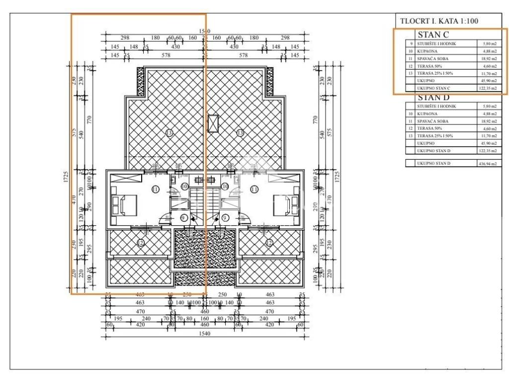 Stan se prostire na dvije etaže 1.kat+2.kat , površine je 124m2 i terasa sa pogledom na more !
