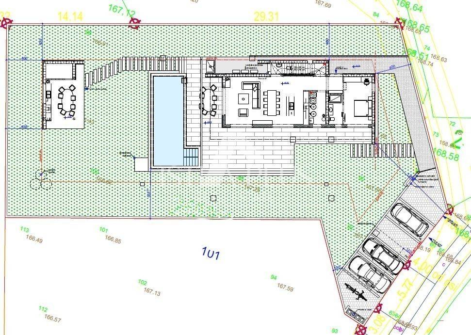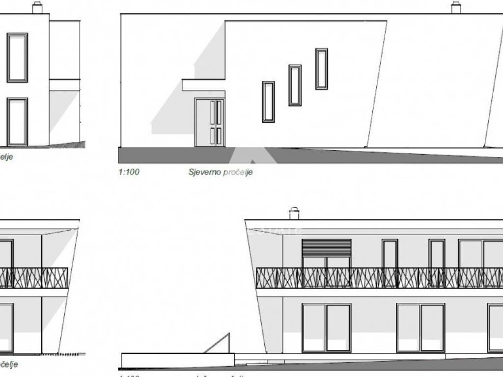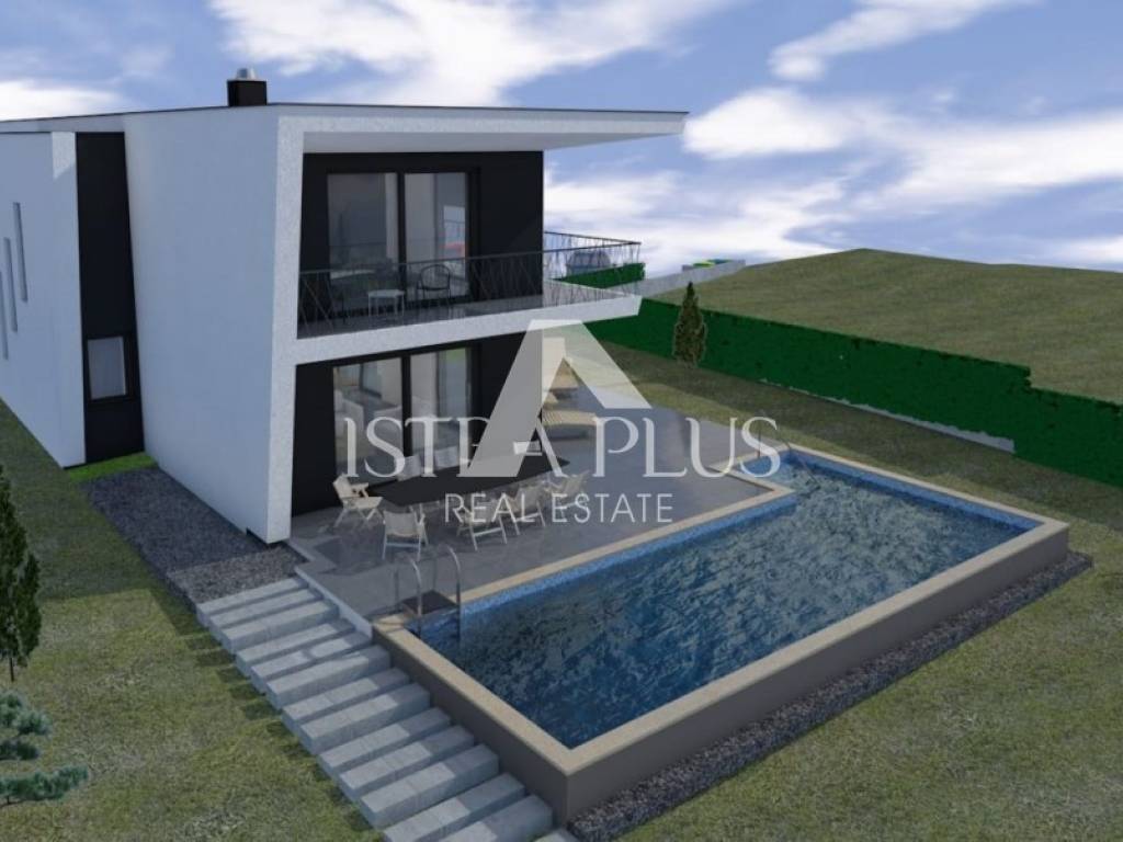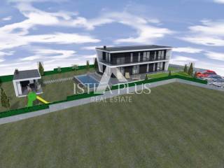 Vila modernog dizajna gradi se na zemljištu od 1080m2 koje je okruženo s jedne strane šumom, a s druge strane ulice su susjedne kuće koje se iznajmljuju tijekom ljetne sezone. Lokacija izuzetno atraktivna za sve koji vole uživati u tišini, a paralelno biti udaljeni par minuta vožnje od većih gradskih centara.