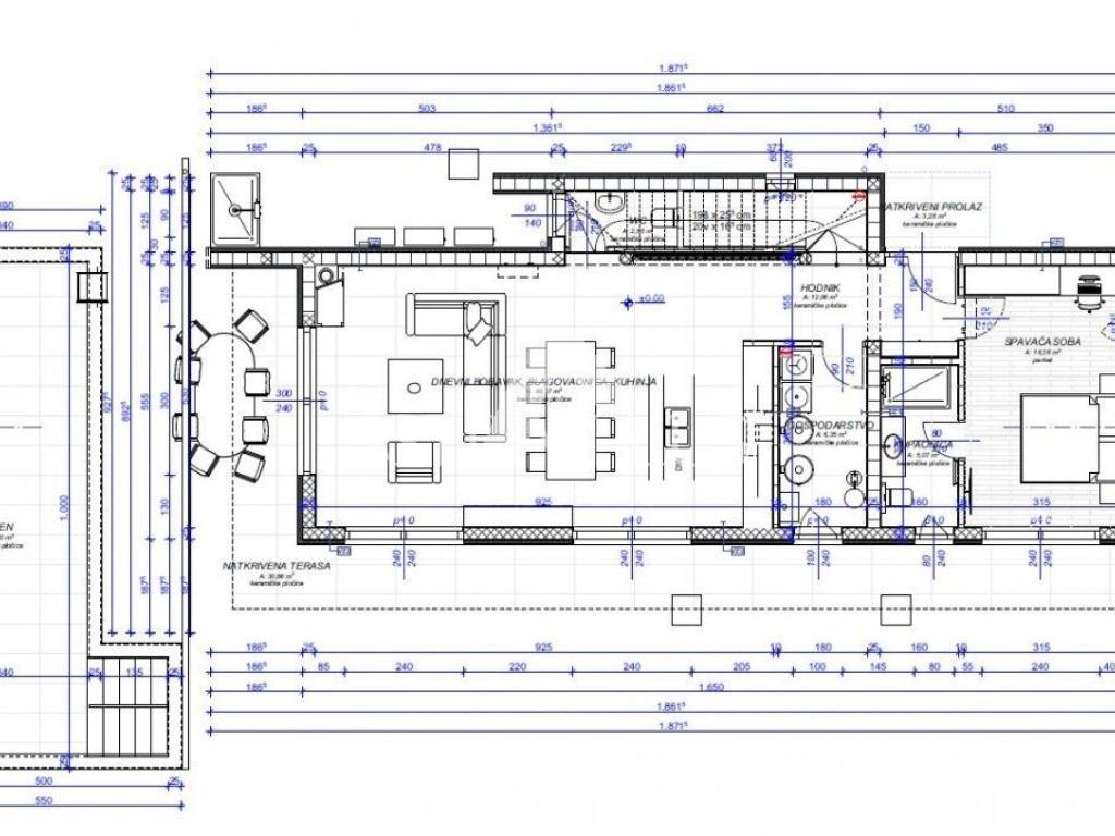 Unutar ograđenog dvorišta vila će raspolagati bazenom veličine 36,30m2 te ljetne kuhinje od 23,88m2 koja je u nastavku povezana sa vanjskim spremištem od 4,91m2.