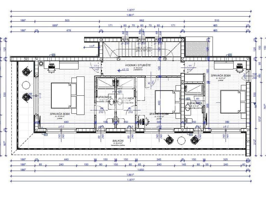 Unutarnjim stubištem pristupa se prostorijama smještenim na prvom katu, tri spavaće sobe s pripadajućim kupaonicama, a iz svake sobe je moguć izlazak na balkon koji nudi pogled na okoliš.