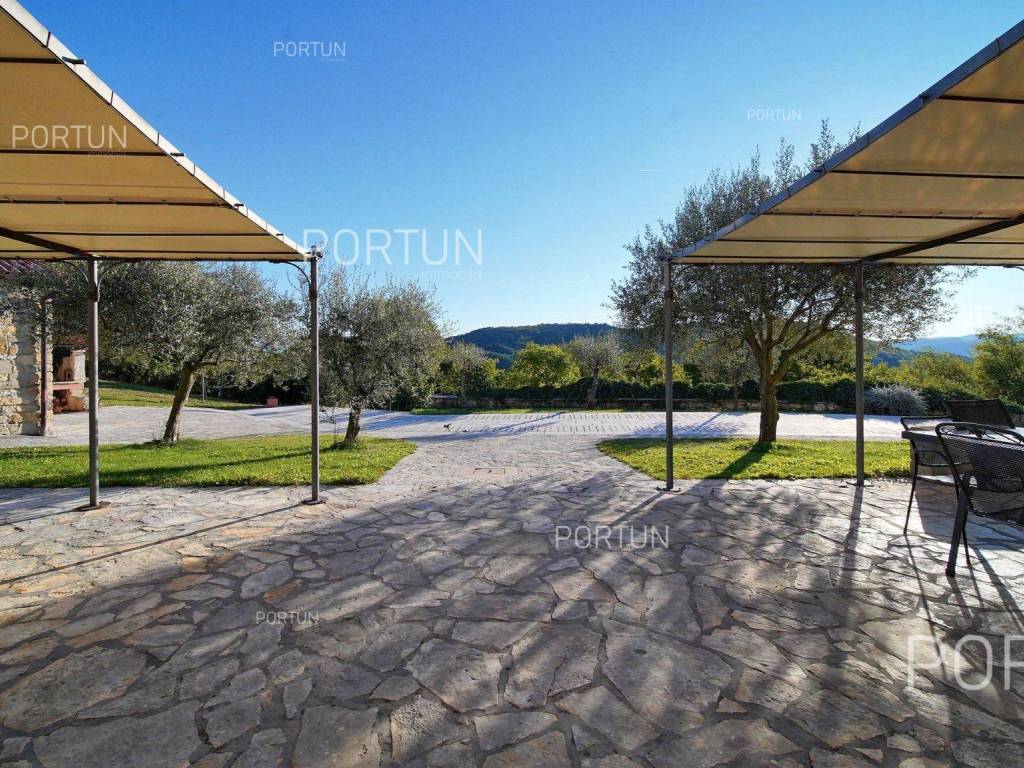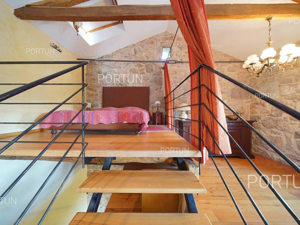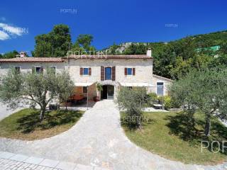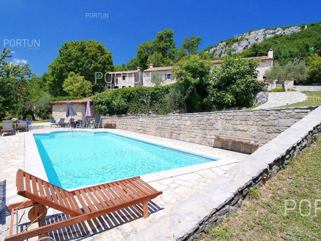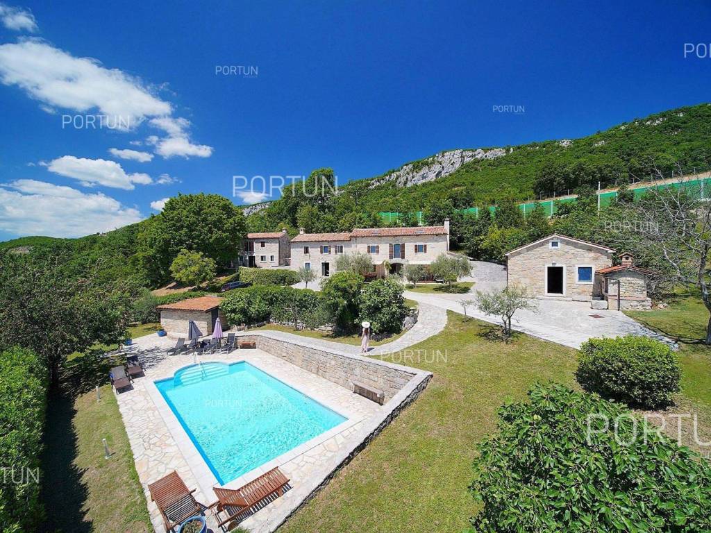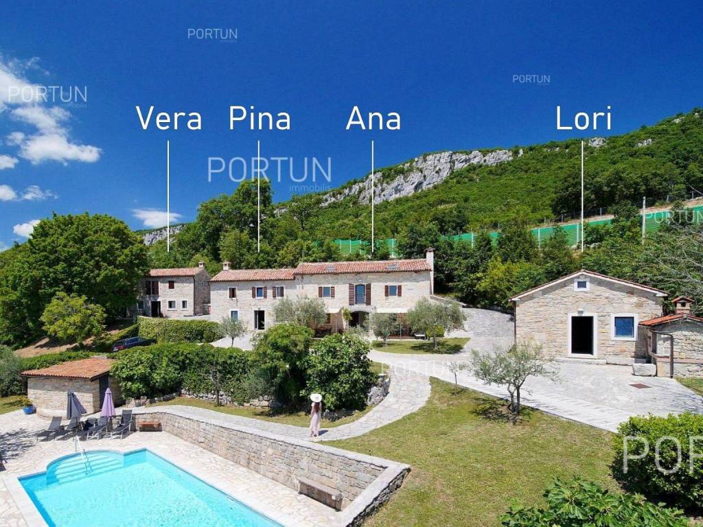 Decentno obnovljeno imanje sa četiri kamene kuće, bazenom, igralištem na zemljištu površine cca 13.000 m2 raspolaže s ukupno 6 spavaćih soba te može ugostiti 12 osoba.