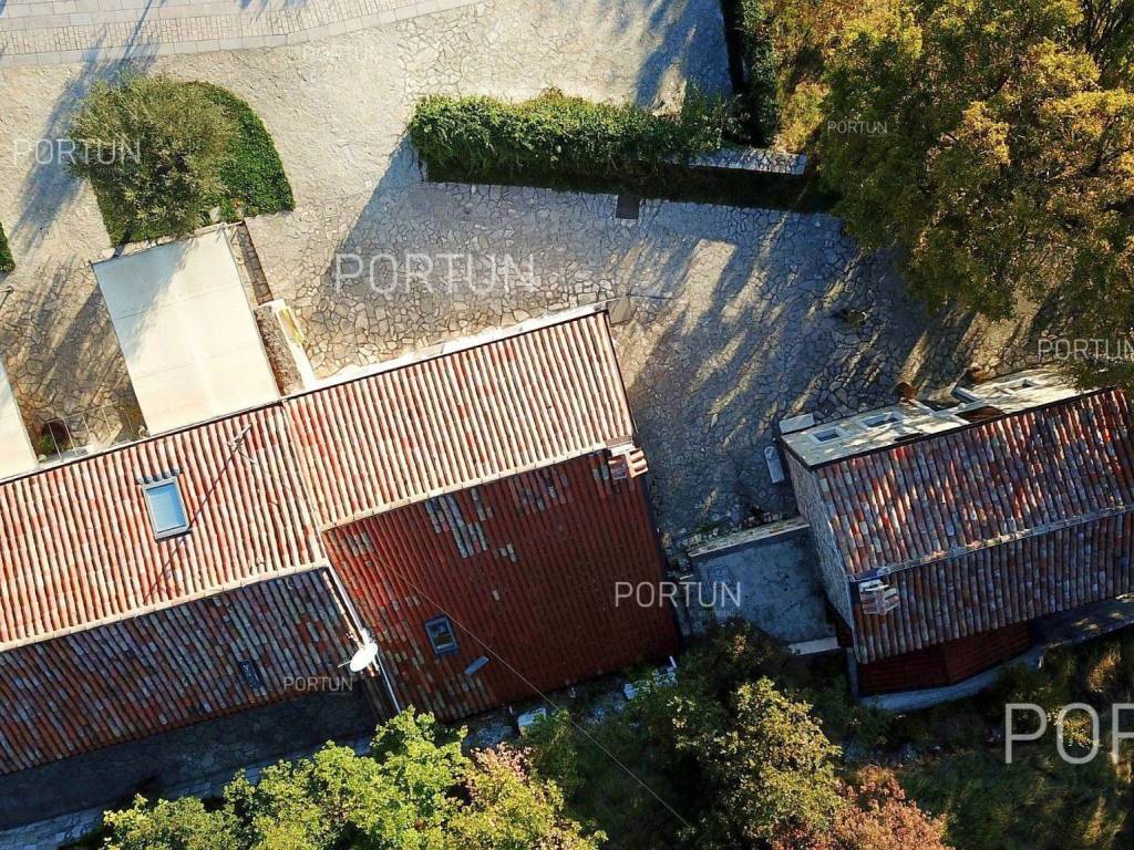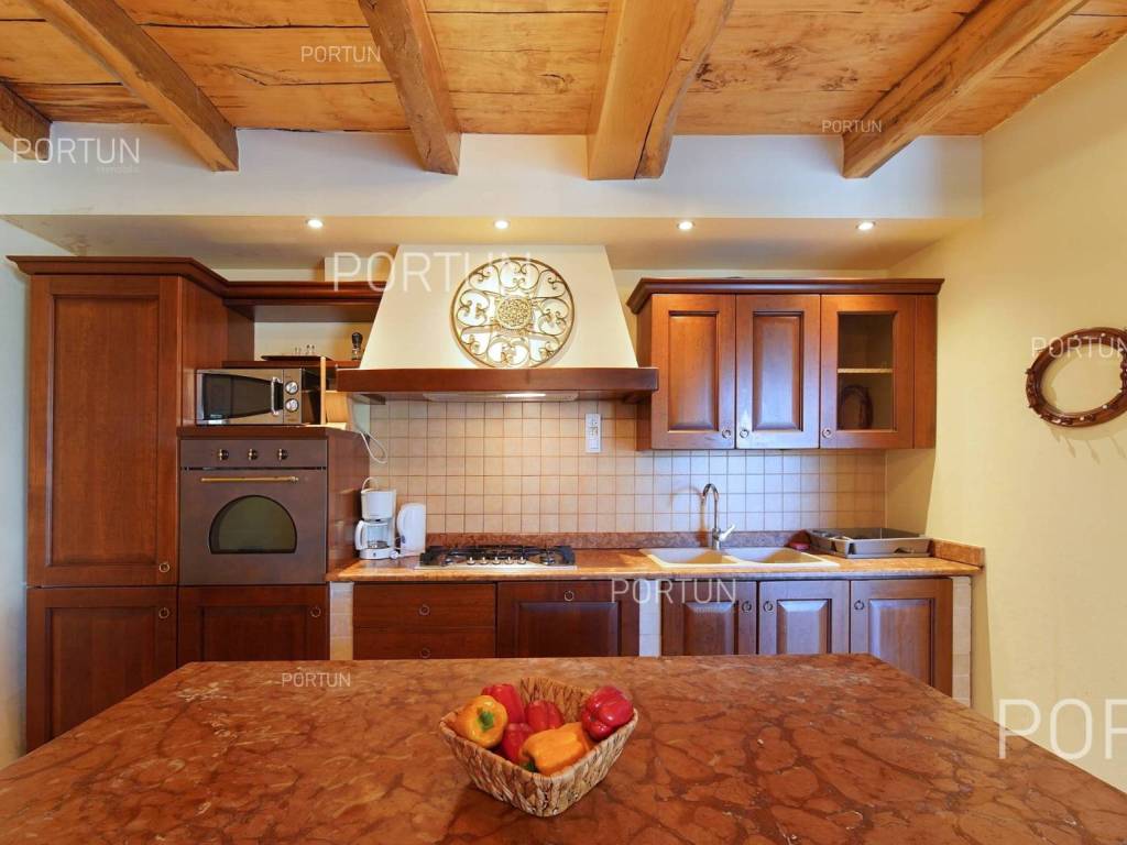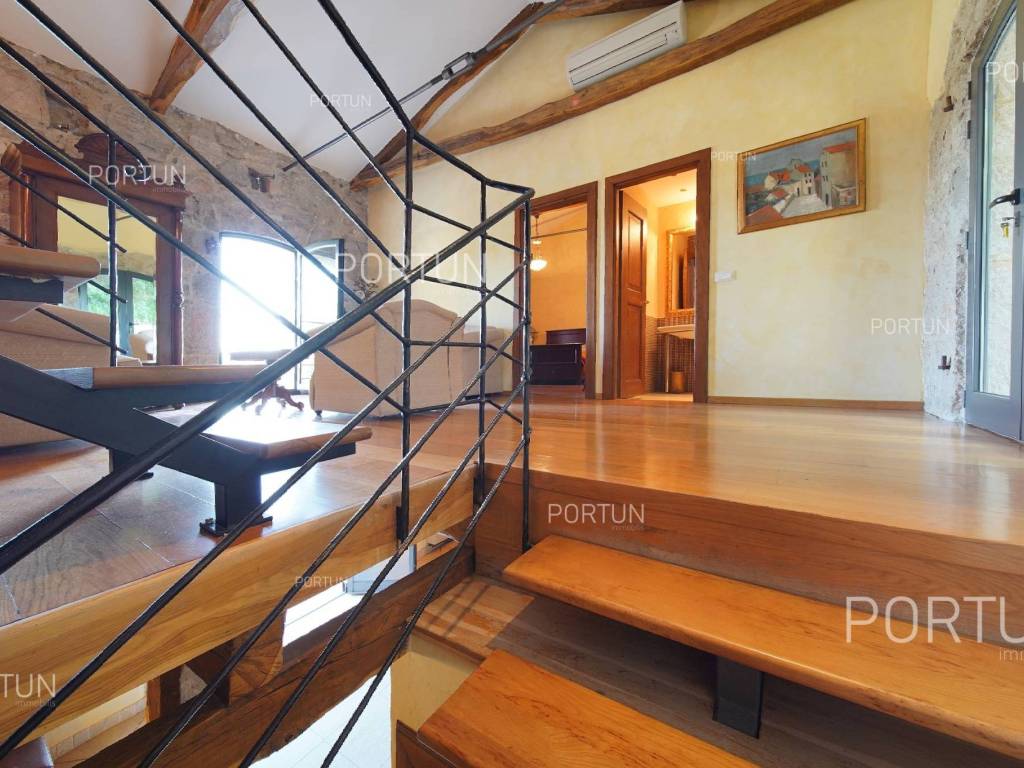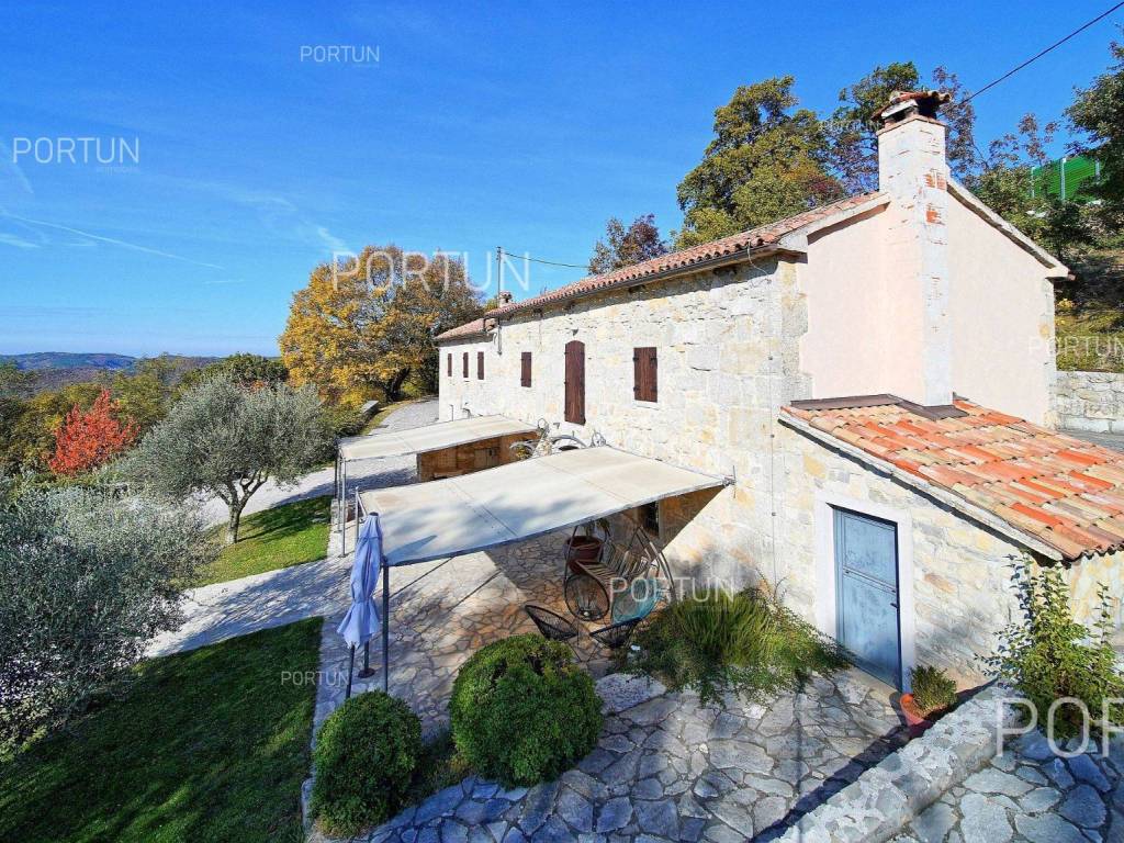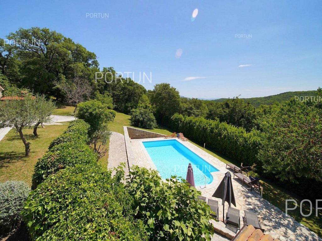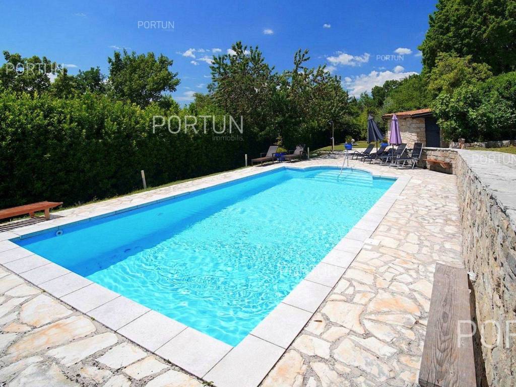 Decentno obnovljeno imanje sa četiri kamene kuće, bazenom, igralištem na zemljištu površine cca 13.000 m2 raspolaže s ukupno 6 spavaćih soba te može ugostiti 12 osoba.
