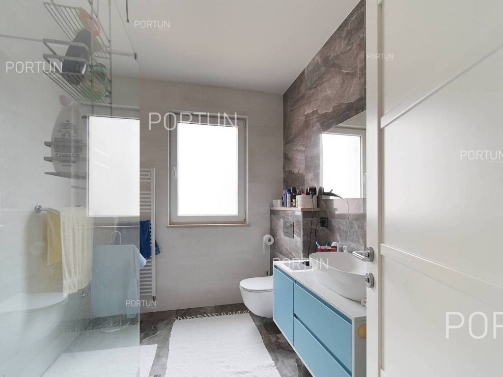 Trosobni stan se nalazi na 1. katu, a kotlovnica, spremište i garaža se nalaze u prizemlju. Stan se sastoji od blagovaonice/dnevnog boravka, kuhinje, tri spavaće sobe, kupaonice, predsoblja i natkrivenih terasa (3x).