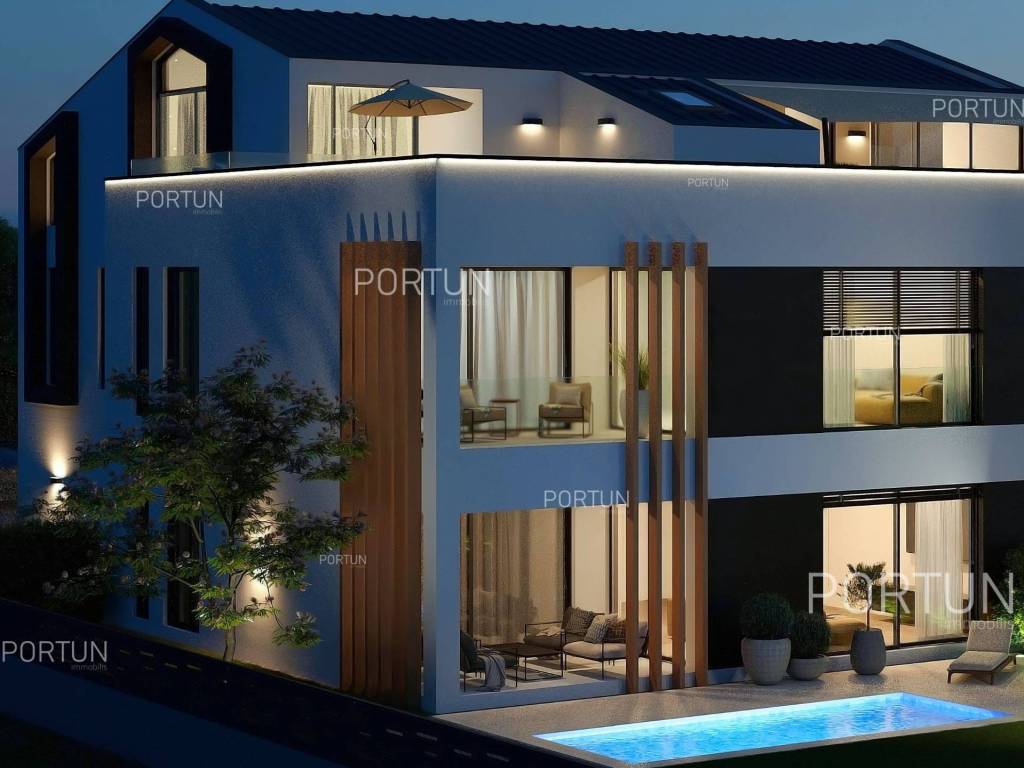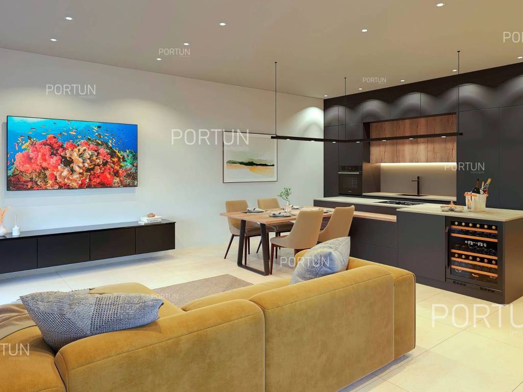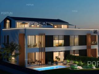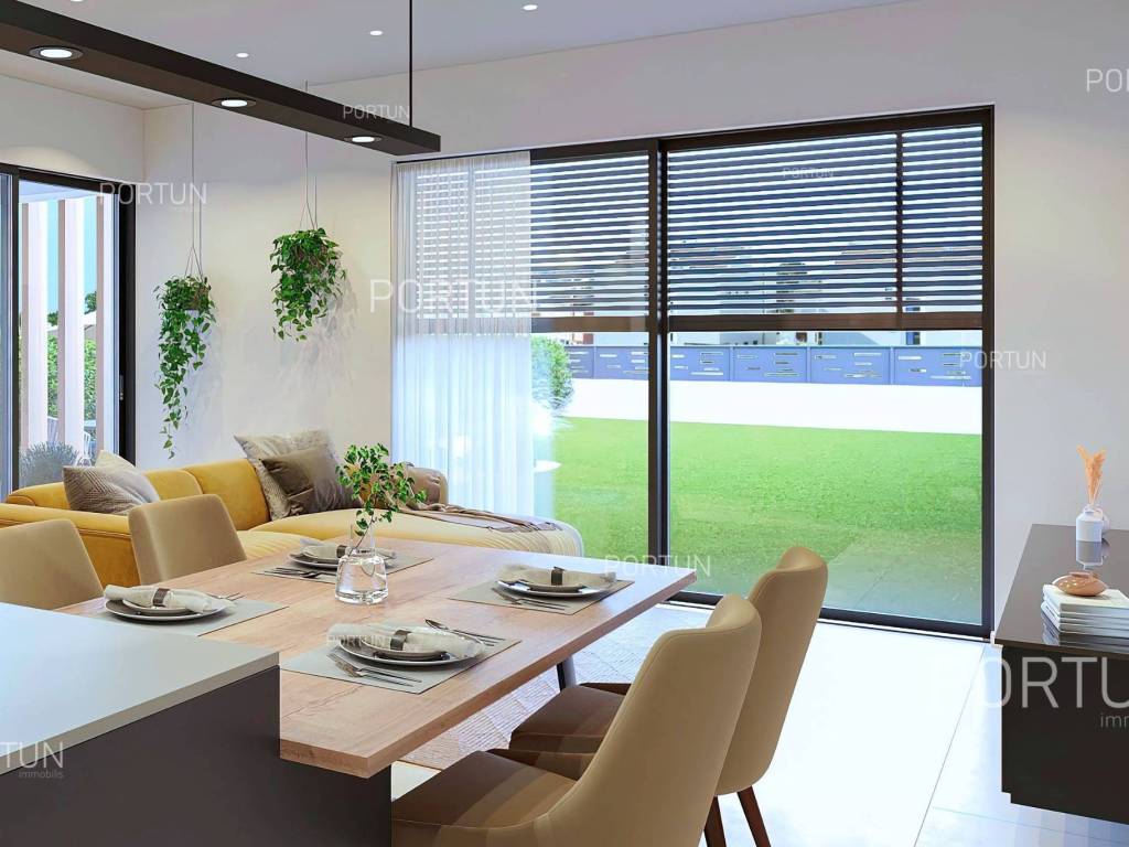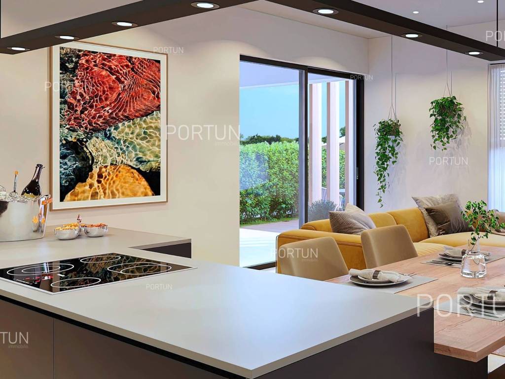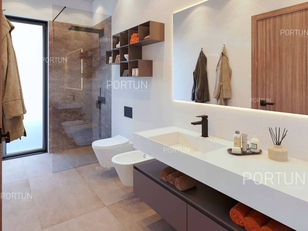 Moderan i funkcionalan stan se nalazi u prizemlju nove stambene vile, a raspolaže s parkingom, garažom, spremištem za bicikle, bazenom te velikim dvorištem. U ovoj zgradi predviđeno je tek šest luksuznih stanova, od kojih je samo četiri na prodaju, a dva stana zadržavaju investitori. Lokacija je iznimno atraktivna, a ujedno i praktična jer se u blizini nalazi vrtić, trgovina, plaža i sportska lučica, a centar grada udaljen je desetak minuta hoda. Mala udaljenost od plaže, vlastiti vrt, jugozapadna orijentacija, garaža i parking su osobine kakve priželjkuju kako mlađi tako i stariji kupci, pa za ovaj stan premda gradnja još nije započela, bilježimo velik interes kupaca. LokacijaIstra predstavlja idealan spoj kristalno čistog mora, brežuljaka i dolina, razigranih rijeka i slapova, suncem okupanih vinograda temnogobrojnih povijesnih i kulturnih znamenitosti. Poznat kao biser istarskog poluotoka, Rovinj je šampion turizma Hrvatske koji ljeti vrvi životom, a zimi pruža mir, obojan čarobnim bojama zalaska sunca i šarmantnom starogradskom jezgrom obogaćenom venecijanskom arhitekturom. Mirna lokacija na području Rovinja, gdje se nalazi stan, bogata je zanimljivostima i raznovrsnim sadržajima:More | Plaža 350 m Usluge | Dućan 400 m - Kafić ili bar 350 m - Osnovna škola 2 km - Dom zdravlja 2,6 km - Apoteka 2,6 km Sport i zabava | Igralište za odbojku 1000 m - Igralište za košarku 1000 m - Park šuma zlatni Rt 4 km Mjesta u blizini | Poreč 34 km - Pula 35 km Promet | Ulaz na autocestu Kanfanar 15 km - Zračna luka Pula 41 km Zanimljivosti | Posebni ornitološki rezervat Palud 12 km RasporedUlaz u vilu je na razini prizemlja, jednako kao i ulaz u stan. Moderno koncipiran stan odličnog rasporeda, površine 144 četvornih metara sastoji se od dnevnog boravka s kuhinjom i blagovaonicom 37,90 m2, dvije spavaće sobe, spavaće sobe s kupaonicom, kupaonice s tušem, jednog hodnika i praonice. Parking i pripadci Parkirno mjesto za jedan automobil Garaža u prizemlju 21,90 m2 Spremište u prizemlju 10,30 m2 Vrt 268,10 m2 Bazen 21,10 m2Svojstva vileStan se nalazi u urbanoj vili koja se prostire kroz prizemlje, jednu nadzemnu etažu i potkrovlje. Ulaz u vilu je izveden u razini prizemlja, sa sjeverozapadne strane, a vertikalna komunikacija se odvija putem unutarnjeg stubišta i dizala. Osnovne arhitektonske karakteristike ove suvremene urbane vile su: 6 Stanova - 10 Parkirnih mjesta - 5 Garaža Vanjski zidovi | Izolacija 10 cm + Zid iz blok opeke Armirano betonska međukatna konstrukcija Početak izgradnje 2024. g. | Planirani završetak izgradnje 2026/6. g.OpremaStolarija | Aluminijska stolarija s dvostrukim ostakljenjem - Rolete - Motorizirana sjenila - Protuprovalna ulazna vrata - Dizajnerska sobna vrataGrijanje i hlađenje | Podno grijanje na dizalicu topline - Klimatizirano - Kombinirani bojler za voduPodne obloge | Vrhunske keramičke pločice - ParketOkolišOprema | Vanjska rasvjetaZelene površine | Travnjak s automatskim navodnjavanjemInfrastruktura Priključak na elektroenergetsku mrežu sa vlastitim brojilom Vlastiti priključak na vodopskrbnu mrežu | Sustav za otklanjanje kamenca Priključak na kanalizaciju Javni makadamski kolni putDokumentacijaRaspoloživa dokumentacija | Građevinska dozvola - Glavni projektObračun površineU površinu stana (144,44 m2) uračunate su površine ovih prostorija:Stambeni prostor = 91,30 m2*Garaža = 16,42 m2**Spremište = 7,73 m2**Parkirno mjesto = 2,18 m2***Vrt = 26,81 m2*****Površine su obračunate s koeficijentom k= 1,00**Površine su obračunate s koeficijentom k= 0,75***Površine su obračunate s koeficijentom k= 0,15****Površine su obračunate s koeficijentom k= 0,10Izvor podataka = Glavni projekt