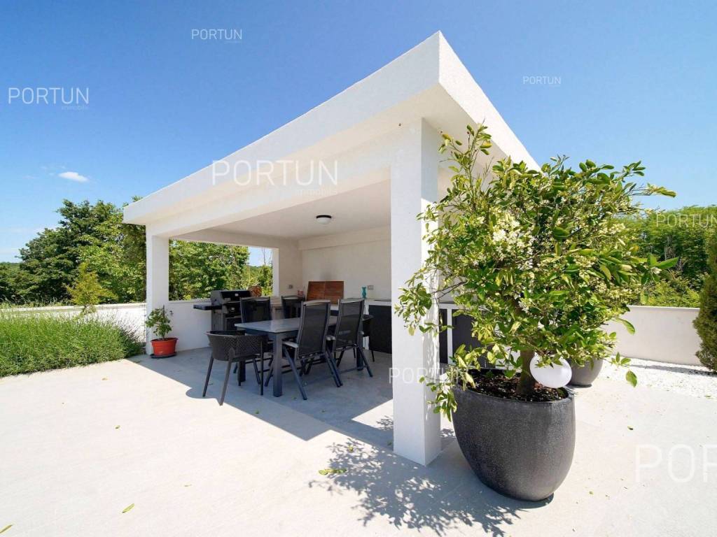 Suvremena vila sa četiri spavaće sobe, voluminoznim dnevnim boravkom i raskošnom zonom za opuštanje nalazi se u mirnom, seoskom ambijentu zapadne Istre te nudi pogled na more i zelenilo. Moderno uređen interijer nudi sav potreban komfor za 8-10 gostiju, a vanjski prostor je podijeljen u nekoliko zona za opuštanje i uživanje pod vedrim nebom. Prizemljem dominira svjetao i prozračan dnevni boravak uređen u neutralnim tonovima, kojega krasi minimalistička rasvjeta i moderan namještaj. Nekoliko stepenica iznad dnevnog boravka smješten je prostor za blagovanje i pripremu hrane. Vrhunski opremljena kuhinja u obliku slova L, moderno je dizajnirana, a u centru se nalazi kuhinjski otok s visećom napom. U prizemlju nalazimo još jednu spavaću sobu s kupanicom, wc i praonicu. Prvi kat je rezerviran za spavaće sobe, kojih ima tri, a svaka ima vlastitu kupaonicu, dok je glavna spavaća soba dodatno opremljena s velikom terasom iz koje se pruža pogled na more. Vanjski prostor suvremeno je uređen i traži minimalno održavanja, dok se istovremeno gostima nudi mogućnost boravka u različitim zonama. Središnji dio dvorišta zauzima pravokutan plavi bazen sa širokim stepeništem, a odmah uz njega nalazi se upuštena lounge zona koja je idealna za večernja druženja s prijateljima uz fire pit. Vrući dani mogu se provoditi u dubokoj hladovinu koju nudi natkrivena terase ili u prijatnoj sjeni koju nudi ljetna kuhinja. Ovdje se može pripremati razna jela na roštilju, uz neizostavno uživanje u istarskim vinima. Zaželite li se masaže i opuštanja u mjehurićima, dovoljno je izaći iz dnevnog boravka i možete se osvježiti u hidromasažnoj kadi. Radi smanjenja potrošnje električne energije na krov su postavljeni fotonaponski paneli ukupne snage 10,7 kW, a kuća je opremljena sa sustavom za omekšanjem vode. Ukratko, ova vila na rubu malog sela u blizini Kanfanara nudi mirno okruženje u prirodnom ambijentu. Sadrži četiri spavaće sobe s vlastitim kupaonicama, pogled na more s prvog kata, prostrani dnevni boravak s velikim staklenim otvorima, natkrivenu terasu s ljetnom kuhinjom, dugi bazen sa sunčalištem, vanjski prostor za druženja, modernu kuhinju s otokom, dnevni boravak s kaminom, privatni parking za pet automobila te potencijal za ulaganje u nekretnine i ljetni turistički najam.LokacijaIstra predstavlja idealan spoj kristalno čistog mora, brežuljaka i dolina, razigranih rijeka i slapova, suncem okupanih vinograda temnogobrojnih povijesnih i kulturnih znamenitosti. Idilična seoska lokacija na zapadnom dijelu Istre, gdje se nalazi vila, nudi brojne prednosti:More Plaža 20 km Usluge Dućan 7 km Osnovna škola 7 km Dom zdravlja 25 km Apoteka 7 km Marina 20 km Sport i zabava Igralište za košarku 7 km Vodeni park Aquacolors 21,6 km Posebni rezervat šumske vegetacije Kontija 13 km Promet Ulaz na autocestu 9 km Zračna luka Pula 43 km O imanjuU sklopu imanja površine 984 četvornih metara, nalaze se: Kuća 4 Spavaće sobe 4 Kupaonice 2 Etaže 228,25 m2Ljetna kuhinja 1 Etaža 15,00 m2Bazen 48,00 m2RasporedModerna vila odličnog rasporeda, površine 228 četvornih metara, prostire se kroz dvije etaže, odnosno kroz prizemlje i 1. kat. Prizemlje Ulaz u vilu je na razini prizemlja. U sklopu ovog kata, površine 139,25 m2, se nalaze dnevni boravak s kuhinjom i blagovaonicom, spavaća soba s kupaonicom, natkrivena terasa, wc i praonica. 1. Kat Unutarnje kamene stepenice vode na gornju etažu, odnosno na 1. kat. U sklopu ove etaže, površine 89,00 m2, se nalaze tri spavaće sobe s kupaonicama. Tri ključne prostorije u ovoj vili su Dnevni boravak s kuhinjom i blagovaonicom Prizemlje 67,00 m2 Zapadna orijentacija Pogled na more Izlaz na terasu Velike staklene stijene Moderna sjedeća garnitura Fotelje (3x) Niski stolić TV Kamin na drva Piazzetta Moderna rasvjeta Kuhinja s otokom Opremljeno s kućanskim uređajima Masivni drveni stol 6 StolicaLjetna kuhinja s blagovaonicom 15,00 m2 Zapadna orijentacija Pogled na more Kuhinja u jednoj liniji Plinski roštilj Moderni stol 6 StolicaSpavaća soba Prizemlje 25,00 m2 Zapadna orijentacija Izlaz u dvorište Moderan dizajn Garderobni ormar Kupaonica s tušem Bračni krevet Toaletni stolić RasvjetaParking Parkiralište za pet automobilaSvojstva vileUlaz u vilu je izveden u razini prizemlja, sa zapadne strane, a vertikalna komunikacija se odvija putem unutarnjeg stubišta. Osnovne arhitektonske karakteristike ove moderne vile su: Etaže Prizemlje + 1. kat Orijentacija Zapad Vanjski zidovi Zid iz opeke + Izolacija stiropor 10 cm Armirano betonska međukatna konstrukcija Krovište Kosi krov - Tondach E. Certifikat U izradi Izgrađeno 2022. g.Namještaj i opremaNamještaj Sav namještaj je uključen u cijeni Moderni namještaj Vanjski namještajOprema Videoparlafon Alarm Videonadzor Smart-house sistem Dizajnerske sanitarijeStolarija Aluminijska stolarija PVC stolarija Zavjese Komarnici Aluminijska ulazna vrata Drvena sobna vrataMultimedia TV u dnevnom boravku Instalacija za TV u svakoj spavaćoj sobiPodne obloge Keramičke pločiceGrijanje i hlađenje Podno grijanje Ventilokonvektori Dizalica topline BAXI Kombinirani bojler za vodu Kamin Dnevni boravakOkolišOprema Vanjska rasvjeta Navodnjavanje kap na kapZelene površine Mediteransko bilje Stara maslina Čempresi LavandeOgrade Živica od leylandii čempresa Betonski zidKolni ulaz Metalna vrata Motorni pogon Krilno otvaranjePješački ulaz Moderna vrata Video parlafonVanjska zona za opuštanje Skimerski bazen 48,00 m2 Betonska konstrukcija Obloga: Folija Slana voda (dezinfekcija pomoću elektrolize klorom) Hidromasažna kada Jacuzzi 6 Osoba Sunčalište Ležaljke Solarni tuš Moderna sjedeća garnituraInfrastruktura Priključak na elektroenergetsku mrežu 18,2 kW Fotovoltaički paneli 10,7 kW Priključak na vodopskrbnu mrežu Sustav za pročišćavanje vode Nobel Biološki pročistač otpadnih voda Septička jama 40 m3 Javni makadamski kolni put Udaljenost do asfaltirane prometnice 80 mStatu