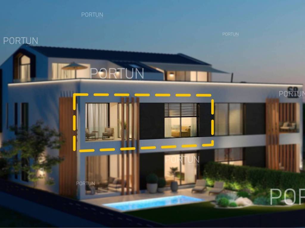 Moderan i prozračan stan s dvije spavaće sobe smješten je u Rovinju, u neposrednoj blizini plaže i šetnice koja vodi do starogradske jezgre. Nalazi se na prvom katu urbane vile koja utjelovljuje sofisticiranost, jednostavnost i moderni dizajn. Dnevni boravak dizajniran je po konceptu open space, čineći svijetlu i prostranu cjelinu zajedno s kuhinjom i blagovaonicom, a tu je i izlaz na natkrivenu terasu. Stan je idealan za četveročlanu obitelj, s dvije spavaće sobe, od kojih svaka ima svoju kupaonicu. Uz stan dolaze garaža i spremište u prizemlju zgrade, te jedno dodatno parkirno mjesto u dvorištu. Prema dogovoru budućih vlasnika i investitora, stan se može opremiti kuhinjom i drugom posebnom opremom. Atraktivan položaj u blizini plaže i povezanost šetnicom sa starogradskom jezgrom Rovinja čine ovaj stan savršenim kako za život, tako i za iznajmljivanje. LokacijaIstra predstavlja idealan spoj kristalno čistog mora, brežuljaka i dolina, razigranih rijeka i slapova, suncem okupanih vinograda temnogobrojnih povijesnih i kulturnih znamenitosti. Šarm Rovinja, najpoznatijeg istarskog primorskog grada, možda dolazi od mješavine venecijanske arhitekture s lijepom lukom i talijanskim vibracijama. More | Plaža 350 m Usluge | Dućan 400 m - Kafić ili bar 350 m - Osnovna škola 2 km - Dom zdravlja 2,6 km - Apoteka 2,6 km Sport i zabava | Igralište za odbojku 1000 m - Igralište za košarku 1000 m - Park šuma zlatni Rt 4 km Mjesta u blizini | Poreč 34 km - Pula 35 km Promet | Ulaz na autocestu Kanfanar 15 km - Zračna luka Pula 41 km Zanimljivosti | Posebni ornitološki rezervat Palud 12 km RasporedUnutarnje dvokrake stepenice vode do ulaza u stan na 1. katu. Moderno koncipiran stan odličnog rasporeda, površine 110 četvornih metara sastoji se od dnevnog boravka s kuhinjom i blagovaonicom 37,90 m2, jedne spavaće sobe, spavaće sobe s kupaonicom, jedne loggie 10,00 m2, kupaonice s tušem i jednog hodnika. Parking i pripadci Parkirno mjesto za jedan automobil 14,50 m2 Garaža 18,00 m2 Spremište 5,70 m2Svojstva vileStan se nalazi u urbanoj vili koja se prostire kroz prizemlje, jednu nadzemnu etažu i potkrovlje. Ulaz u vilu je izveden u razini prizemlja, sa sjeverozapadne strane, a vertikalna komunikacija se odvija putem unutarnjeg stubišta. Osnovne arhitektonske karakteristike ove suvremene urbane vile su: 6 Stanova - 10 Parkirnih mjesta - 5 Garaža Vanjski zidovi | Izolacija + Zid iz blok opeke Armirano betonska međukatna konstrukcija Početak izgradnje 2024. g. | Planirani završetak izgradnje 2026/6. g.OpremaStolarija | Aluminijska stolarija s dvostrukim ostakljenjem - Aluminijska ulazna vrata - Klasična sobna vrataGrijanje i hlađenje | Podno grijanje na dizalicu topline - Klimatizirano - Kombinirani bojler za voduPodne obloge | Vrhunske keramičke pločice - ParketOkolišOprema | Vanjska rasvjetaZelene površine | Travnjak s automatskim navodnjavanjemInfrastruktura Priključak na elektroenergetsku mrežu sa vlastitim brojilom Vlastiti priključak na vodopskrbnu mrežu Priključak na kanalizaciju Asfaltirana javna prometnicaDokumentacijaRaspoloživa dokumentacija | Građevinska dozvola - Glavni projektObračun površineU površinu stana (109,75 m2) uračunate su površine ovih prostorija:Stambeni prostor = 82,30 m2*Loggia = 7,50 m2**Garaža = 13,50 m2**Spremište = 4,28 m2**Parkirno mjesto = 2,18 m2****Površine su obračunate s koeficijentom k= 1,00**Površine su obračunate s koeficijentom k= 0,75***Površine su obračunate s koeficijentom k= 0,15Izvor podataka = Glavni projekt