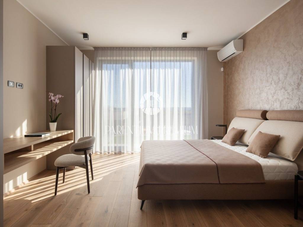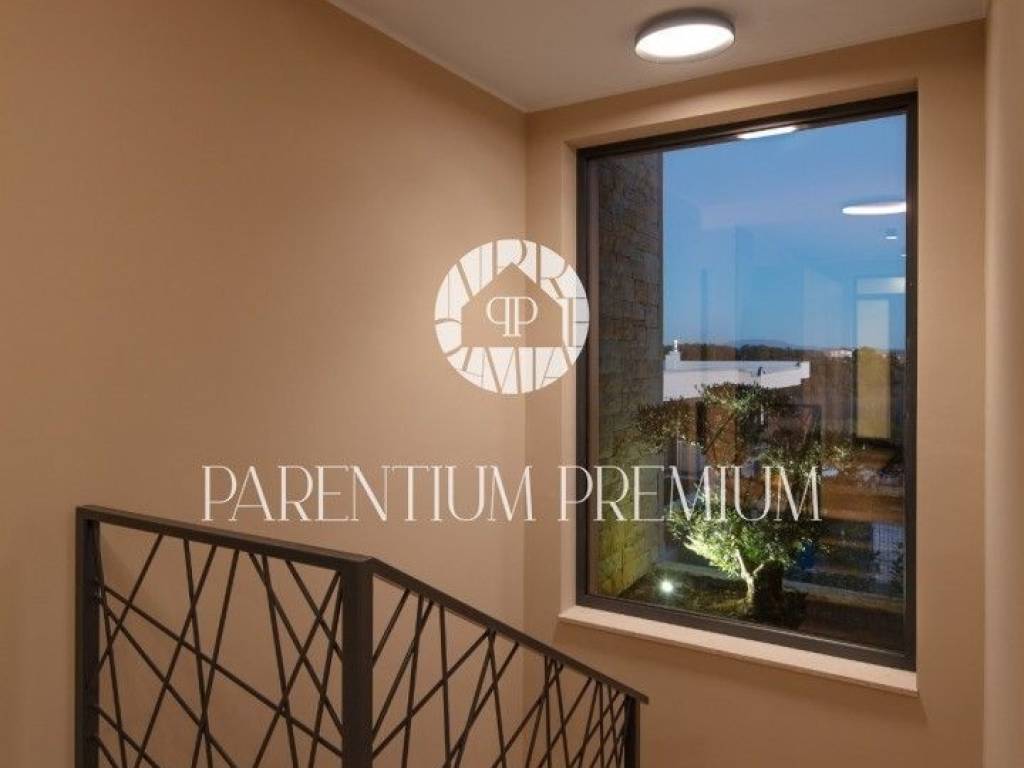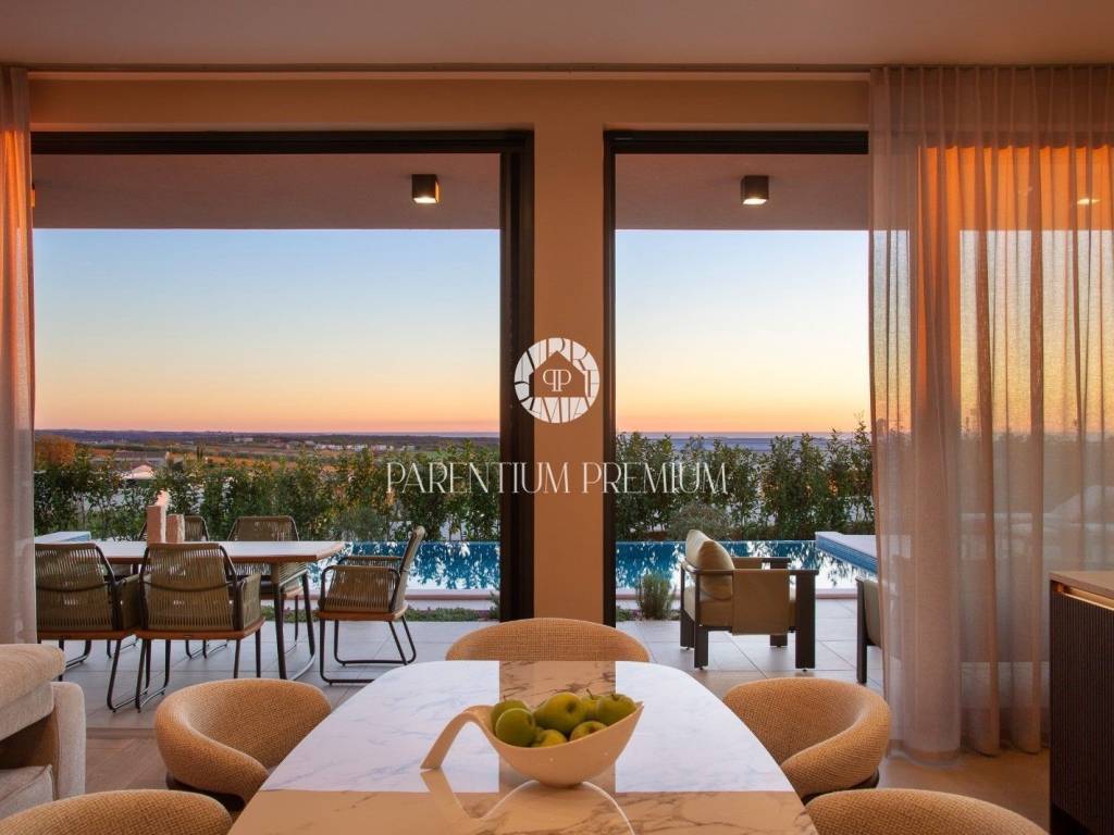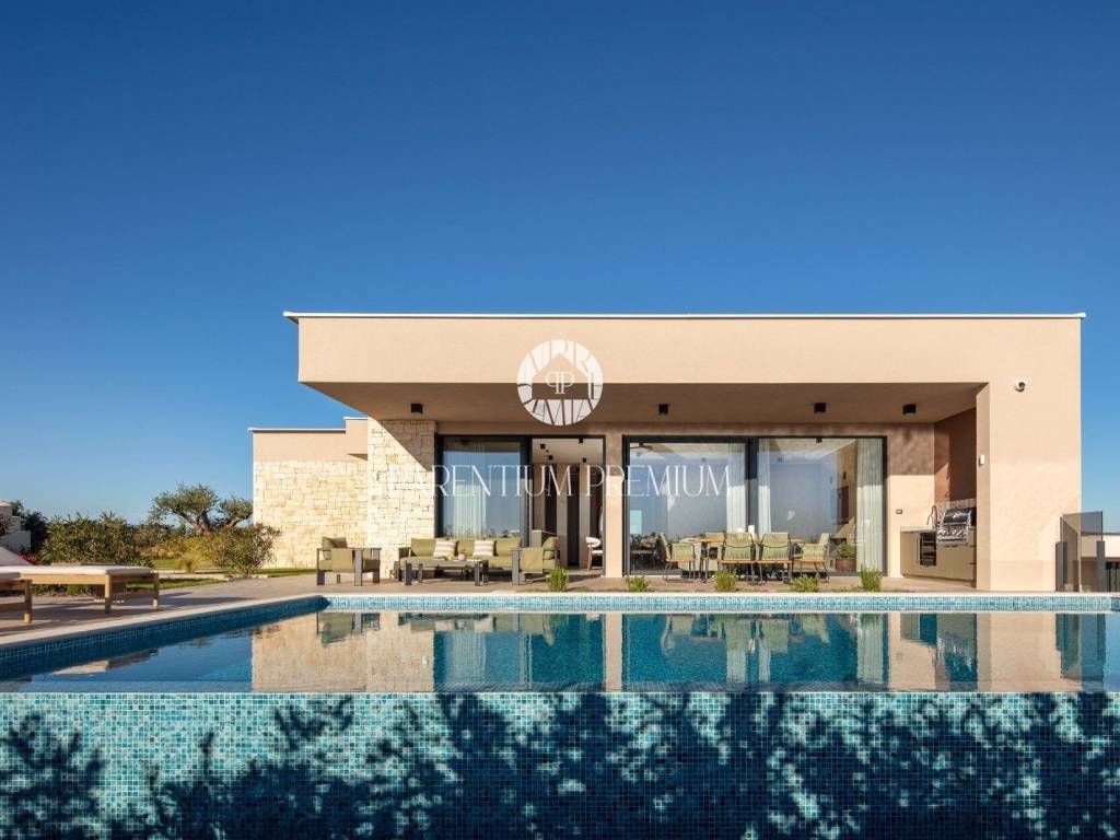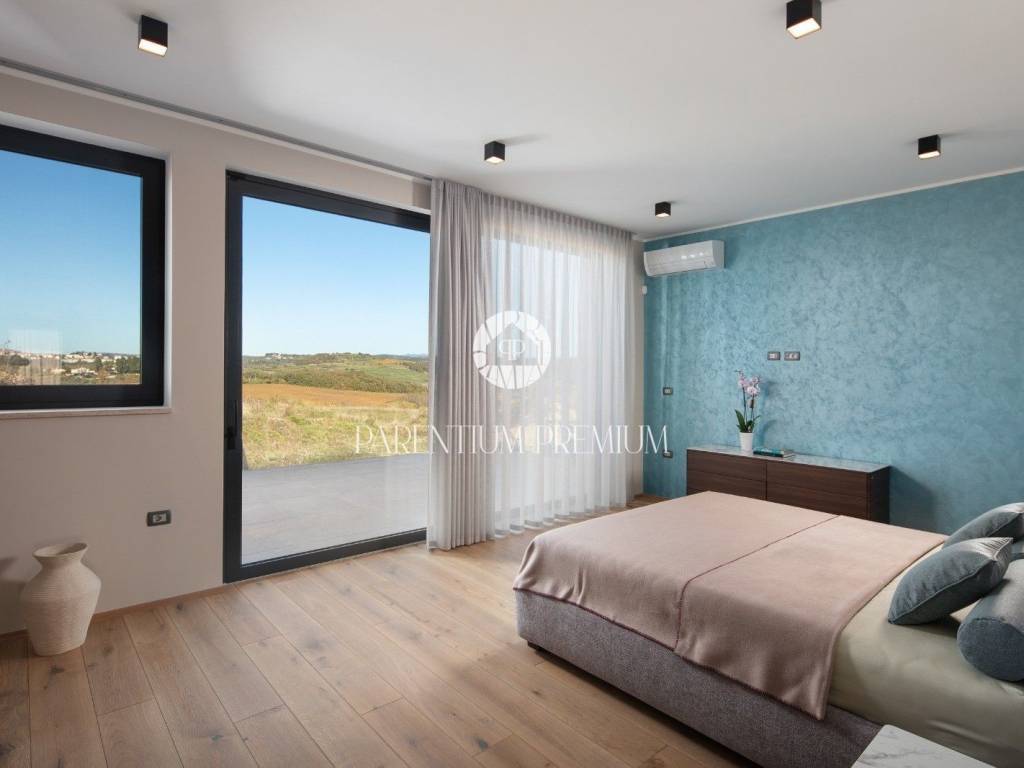 Istra,Novigrad Na brežuljku , u srcu čarobne istarske prirode, među vinogradima i maslinicima koji se protežu do horizonta, smjestila se ova suvremena luksuzna vila – dom koji spaja eleganciju modernog dizajna s toplinom mediteranskog ambijenta. Okružena potpunim mirom i zelenilom, vila se prostire na 320 m² stambenog prostora, smještenog na velikoj parceli od cca 1.500 m². Svaki njezin kutak pažljivo je osmišljen kako bi pružio savršenu ravnotežu između luksuza, privatnosti i udobnosti, uz prekrasan pogled na more, vinograde i brežuljke Buja i Brtonigle. Udaljena je svega 6 kilometara od mora, što omogućuje idealan spoj – blizinu obale i potpunu tišinu i privatnost koje pruža istarsko zaleđe.Vila je na tromeđi triju država – Hrvatske, Slovenije i Italije. Položaj je strateški izvanredan: Trst je udaljen svega 35 km, dok su zimski ski centri dostupni u tek 2.5 sata. Komunikacijski i logistički položaj je savršen – u blizini se nalaze tri međunarodna aerodroma (Pula 45 min, Trst Ronchi 45 min, Ljubljana 1.5h) te Venezia i Treviso na cca 2.5h. Na svega 15 minuta nalazi se i privatni aerodrom Portorož – što ovu nekretninu čini izuzetno atraktivnom za investitore, vlasnike jahti, poslovne putnike, family office segment i luxury buyer profil iz cijele Europe.Vila je orijentirana tako da je okupana suncem tijekom cijelog dana, s impresivnim zalascima sunca koji se pružaju preko mora. Prostire se na dvije etaže: u suterenu se nalazi wellness zona sa saunom, teretana, prostor za druženje i zabavu (koji se može prenamijeniti u obiteljsko kino), spremište i kotlovnica. Prizemlje čini središnji životni prostor vile – četiri prostrane spavaće sobe, svaka s vlastitom kupaonicom, gostinjski toalet, te open-space dnevni boravak s kaminom, kuhinja i blagovaonica. Velike staklene stijene povezuju unutarnji prostor s vanjskim terasama i lođama, stvarajući dojam prozračnosti i jedinstva s prirodom. Na sunčanoj terasi nalazi se grijani infinity bazen površine 40 m² i dubine 1,7 m, obložen keramikom i opremljen elektrolizom vode.Vila je novoizgrađena, potpuno namještena vrhunskim materijalima i modernim dizajnom. Opremljena je podnim grijanjem putem toplinske pumpe, klima uređajima, te kaminom u dnevnom boravku. Okućnica je uređena autohtonim mediteranskim biljem, maslinama i lavandom, a prostrani vrt i kamenom popločana terasa pružaju idealno mjesto za odmor, druženje i uživanje u prirodi.Brtonigla je jedan od najšarmantnijih istarskih gradića, poznat po vinima, maslinovom ulju i izvrsnoj gastronomiji. Vila se nalazi na mirnom dijelu, s pogledom koji oduzima dah, a u neposrednoj blizini nalaze se poznate vinarije, biciklističke staze i autentične tradicionalne konobe. More i plaže udaljeni su samo desetak minuta vožnje.Ova vila nije samo kuća – to je miran, luksuzan životni stil usred prirode, uz pogled koji svakodnevno oduzima dah. Savršena je kao obiteljska rezidencija, kuća za odmor ili investicija u turistički najam visoke kategorije.