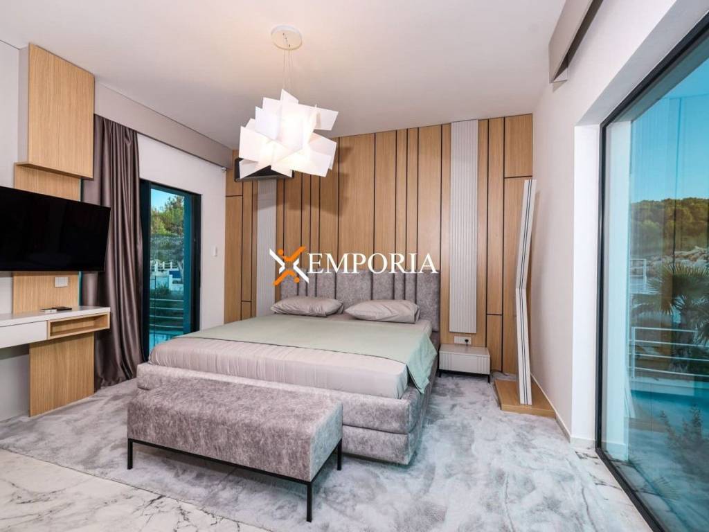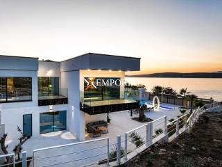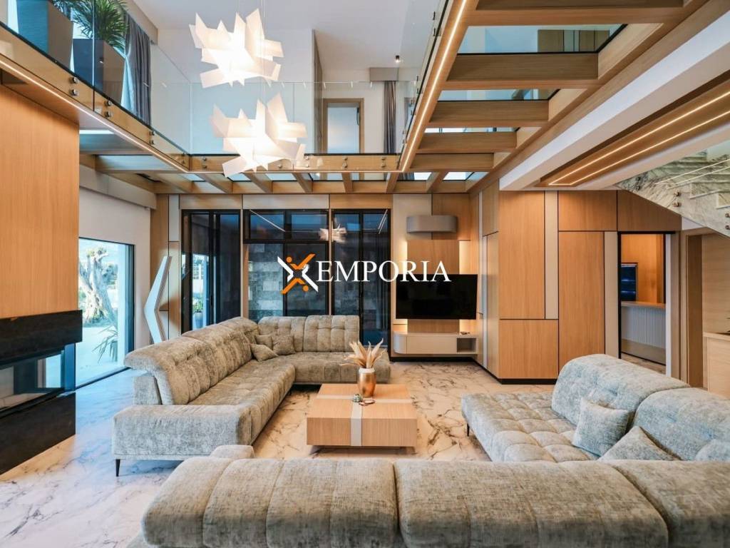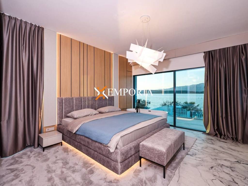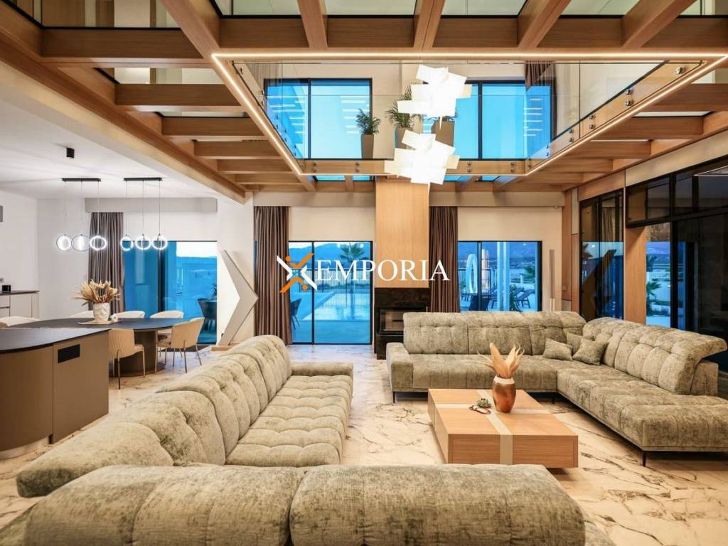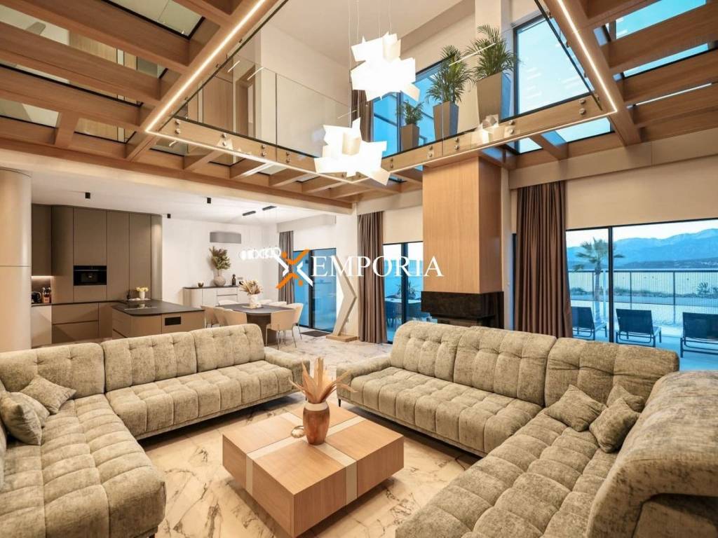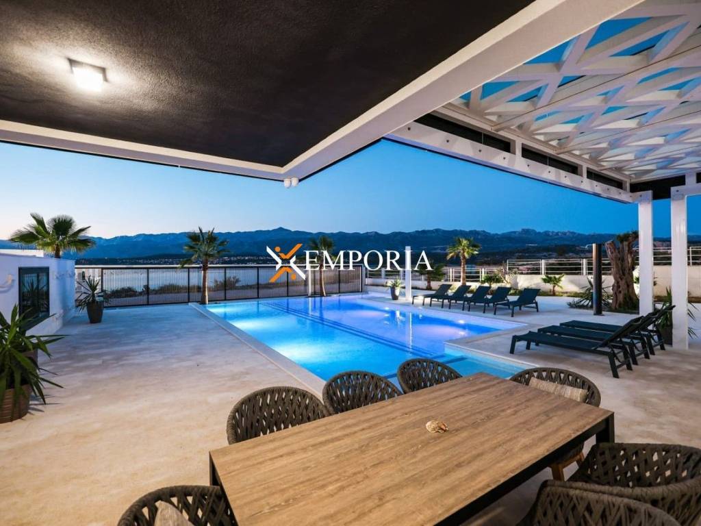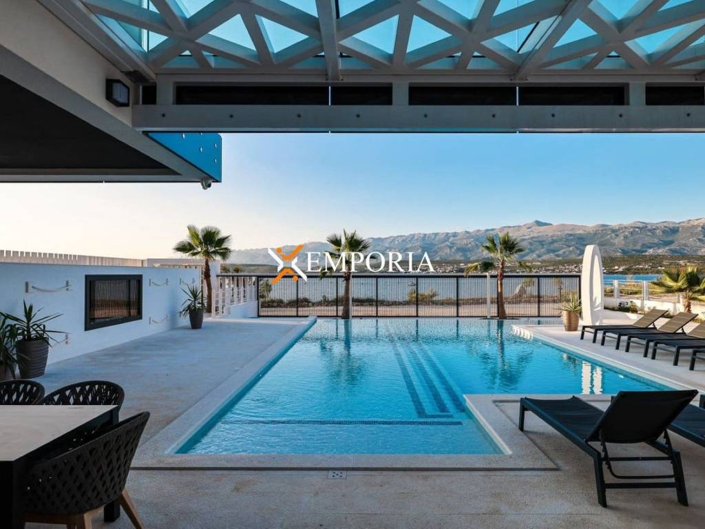 Na prodaju je vrhunska luksuzna vila smještena prvi red do mora u Novigradu, svega 35 m od plaže i 1 km od centra mjesta. Vila nudi savršenu kombinaciju moderne arhitekture, vrhunske opreme i impresivnog pogleda na more.Ukupna neto površina vile iznosi 482,08 m², dok ukupna površina s bazenima doseže 554,08 m². Nalazi se na uređenoj parceli od 1.100 m², okruženoj borovima, palmama i maslinama.U prizemlju se nalaze ulazni natkriveni prostor, predsoblje, hodnik i stubište, prostrani dnevni boravak, blagovaonica i kuhinja, prostor unutarnjeg bazena s jacuzzijem i saunom, kupaonica, praonica, spremište te natkrivena terasa s vanjskom kuhinjom i velikim bazenom od 90 m² s grijanjem.Na katu se nalaze galerija te četiri spavaće sobe, svaka sa svojom kupaonicom, kao i dvije terase i dvije natkrivene terase koje pružaju prekrasan panoramski pogled na more.Na uređenom dvorištu nalaze se četiri vanjska parkirna mjesta i roštilj. Kuća ima dimnjak i kamin, a krovište je novo, ravno i betonsko.