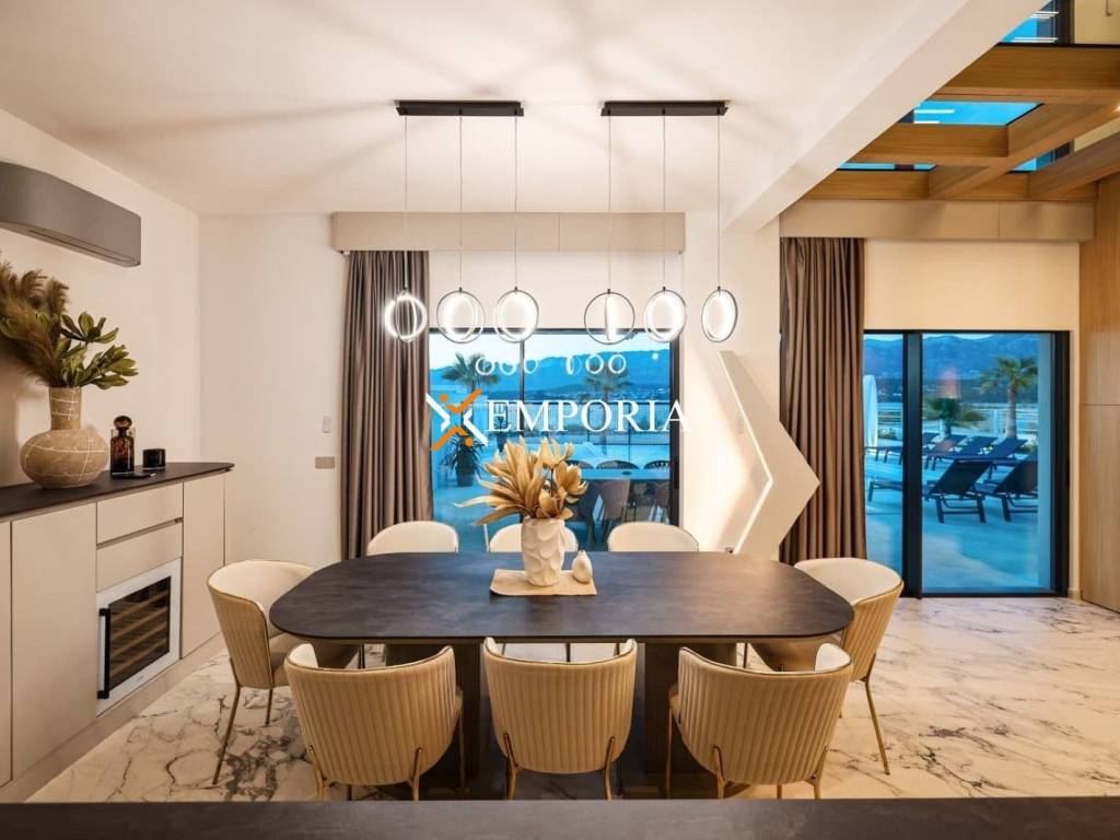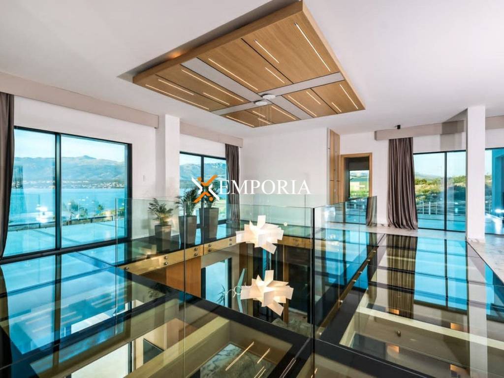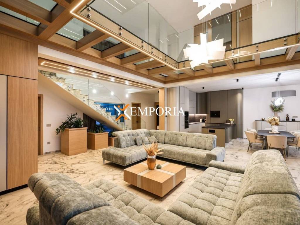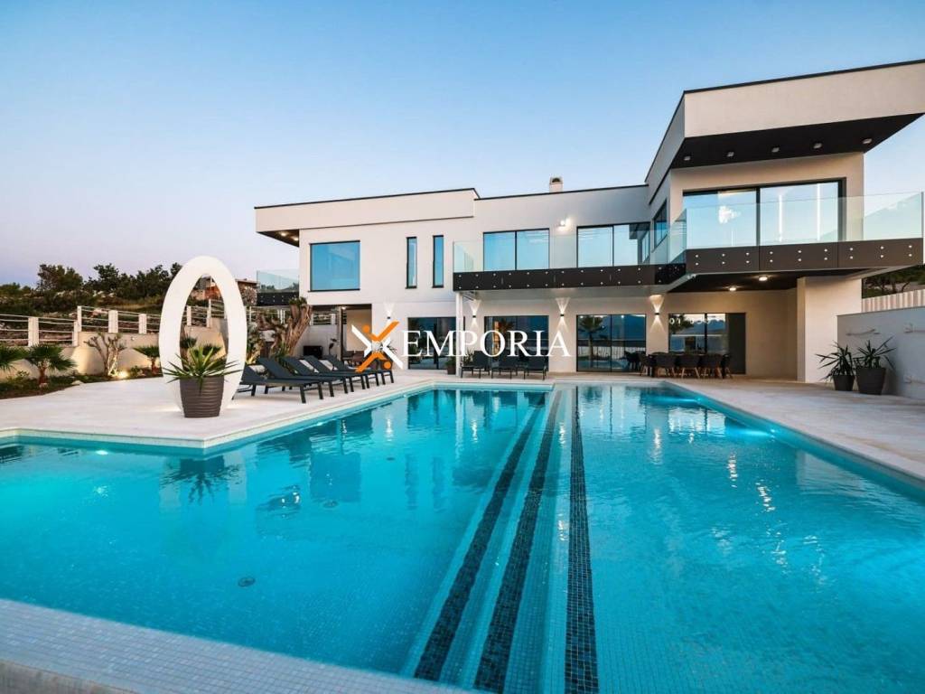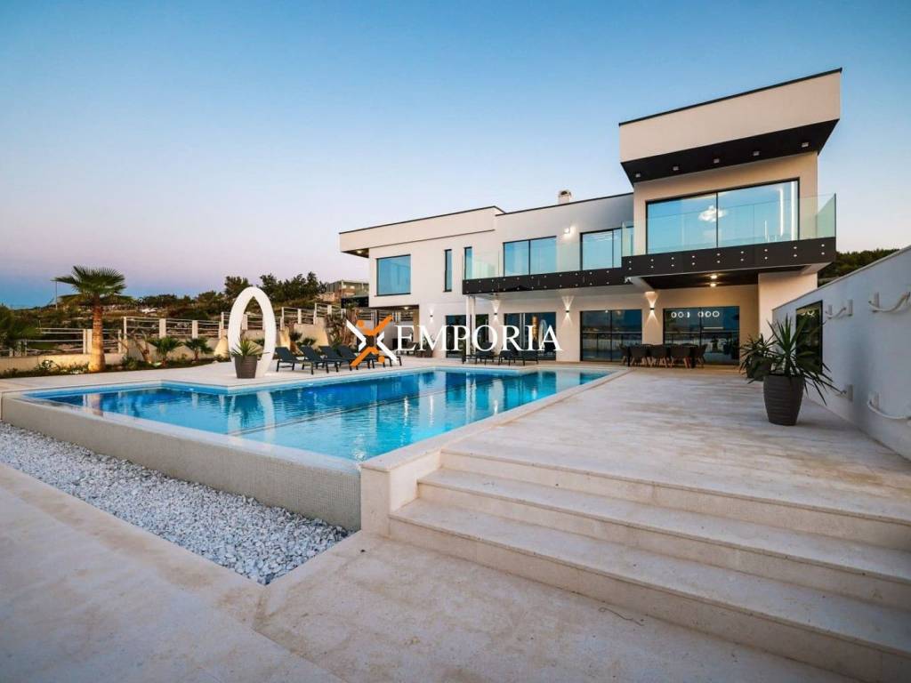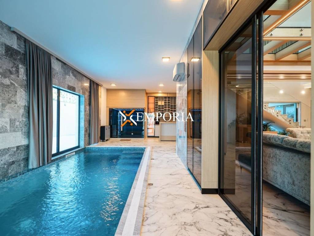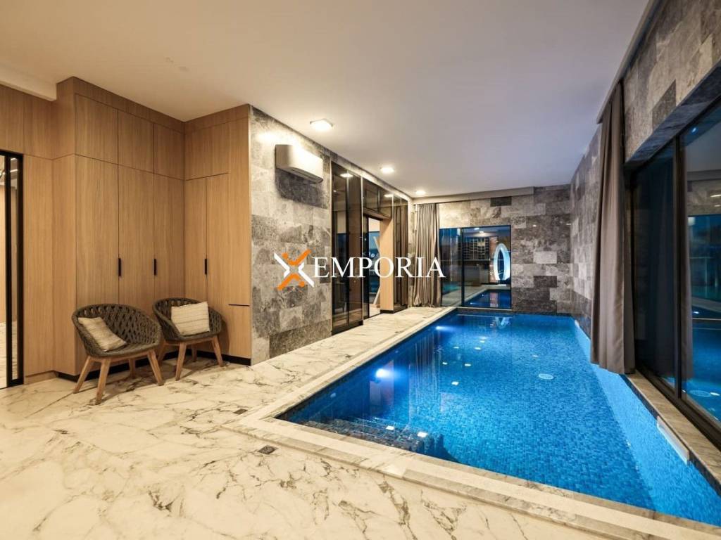 Na prodaju je vrhunska luksuzna vila smještena prvi red do mora u Novigradu, svega 35 m od plaže i 1 km od centra mjesta. Vila nudi savršenu kombinaciju moderne arhitekture, vrhunske opreme i impresivnog pogleda na more.Ukupna neto površina vile iznosi 482,08 m², dok ukupna površina s bazenima doseže 554,08 m². Nalazi se na uređenoj parceli od 1.100 m², okruženoj borovima, palmama i maslinama.U prizemlju se nalaze ulazni natkriveni prostor, predsoblje, hodnik i stubište, prostrani dnevni boravak, blagovaonica i kuhinja, prostor unutarnjeg bazena s jacuzzijem i saunom, kupaonica, praonica, spremište te natkrivena terasa s vanjskom kuhinjom i velikim bazenom od 90 m² s grijanjem.Na katu se nalaze galerija te četiri spavaće sobe, svaka sa svojom kupaonicom, kao i dvije terase i dvije natkrivene terase koje pružaju prekrasan panoramski pogled na more.Na uređenom dvorištu nalaze se četiri vanjska parkirna mjesta i roštilj. Kuća ima dimnjak i kamin, a krovište je novo, ravno i betonsko.
