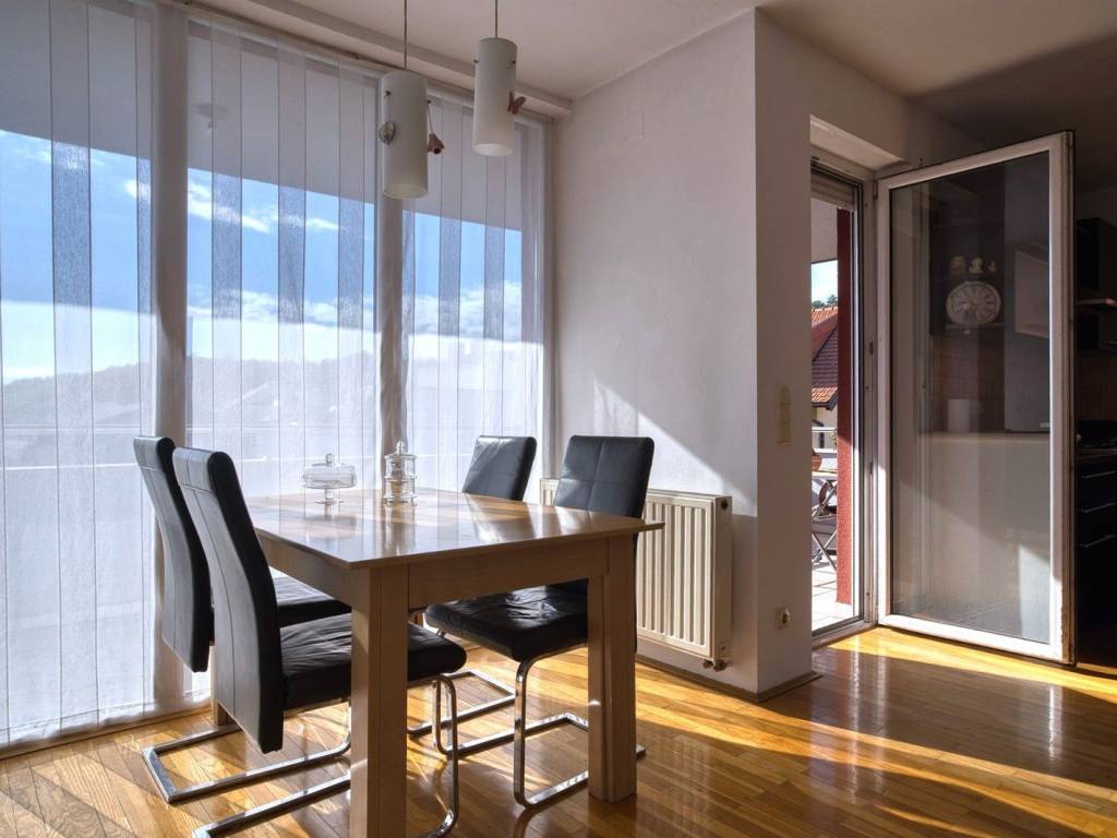 Stan krasi prostrana, južno orijentirana terasa od cca 40 m2 s koje se pruža spektakularan panoramski pogled na grad i zelenilo, a cijeli interijer obiluje dnevnim svjetlom. JAKO DOBAR DOJAM!!!