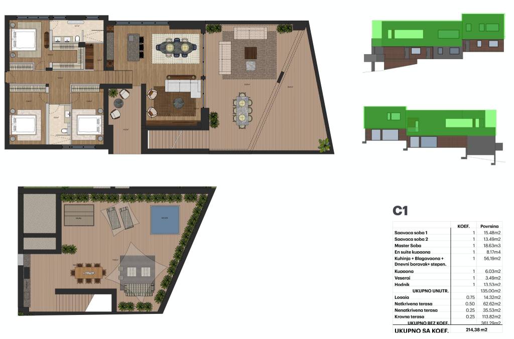 Maksimir, Barutanski jarak, NOVOGRADNJA, vrhunska lokacija okružena zelenilom i prirodom, a opet u neposrednoj blizini centra grada i parka Maksimir. Projekt luksuzne zgrade građene prema najvišim standardima s ukupno 4 stana. Useljenje ljeto 2026. godine.Stan C1 - četverosoban stan na prvom katu zatvorene površine 135,00 m2, loggia 14,32 m2, natkrivena terasa 62,62 m2, nenatkrivena terasa 35,53 m2, krovna terasa 113,82 m2. Stan se sastoji od ulaznog prostora, dnevnog boravka, blagovaonice i kuhinje otvorenog tlocrta s izlazom na terase, master sobe s garderobom i kupaonicom, dvije spavaće sobe kupaonice i vešeraja. Ukupno obračunski NKP 214,38 m2.Zgradu i stanove odlikuje najviši stupanj opreme i suvremena tehnologije u pogledu instalacija i upravljanja istima, dok energetska učinkovitost zadovoljava najviše standarde.Vrhunska keramika - Vives Ceramica (zid), Iris Ceramica 120 x 60 cm (pod), Mirage 80 x 80 cm (pod outdoor).Ulazna vrata- Aluminijska protuprovalna vrata Antracit s obje strane + Rukohvat 1800 mm (HLM). Sobna vrata- Filomuro vrata po mjeri RAL 9016. Vanjska stolarija - PVC + Aluminij s roletama na električno upravljanje (troslojno staklo).Sanitarije više klase - miješalica wc zidna podžbukna Zuchetti Pan Brushed Nickel, tuš zidni podžbukni set s kišnim tušem 250fi Zucchetti Pan Brushed Nickel, wc školjka globo ceramica (no rim , sporo spuštajuća daska , konzolna), tipkalo soft touch TECE, vodokotlić ugradbeni TECE profil.Parket Galeković četkani hrast 600 x 1800 x 15 mm višeslojni. Grijanje - podno plinsko. Hlađenje - Klima jedinice Mitsubishi (spavaća soba, dnevni boravak). Ulaz - kamera na prepoznavanje tablica i električno upravljanje vratima.Obavezna kupnja garažnog i vanjskog parkirnog mjesta.Prekrasna lokacija s puno privatnosti idealna za uživanje, mirno i kvalitetno življenje. Dobra prometna povezanost, blizina svih potrebnih sadržaja.Za sve ostale informacije stojimo na raspolaganju.