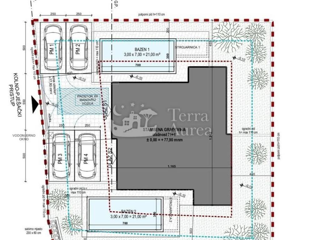 Zemljište ima izrađeni projekt za izgradnju dvojne kuće, pri čemu je za svaku stambenu jedinicu predviđen vlastiti bazen. Građevinska dozvola je u fazi ishođenja što kupcu omogućuje brži početak gradnje.