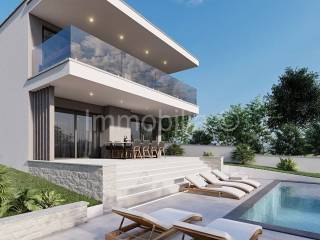 On the ground floor of the villa there is a large living room, kitchen, and dining room with access to the terrace, which is followed by stairs leading down to the swimming pool with sunbathing area.