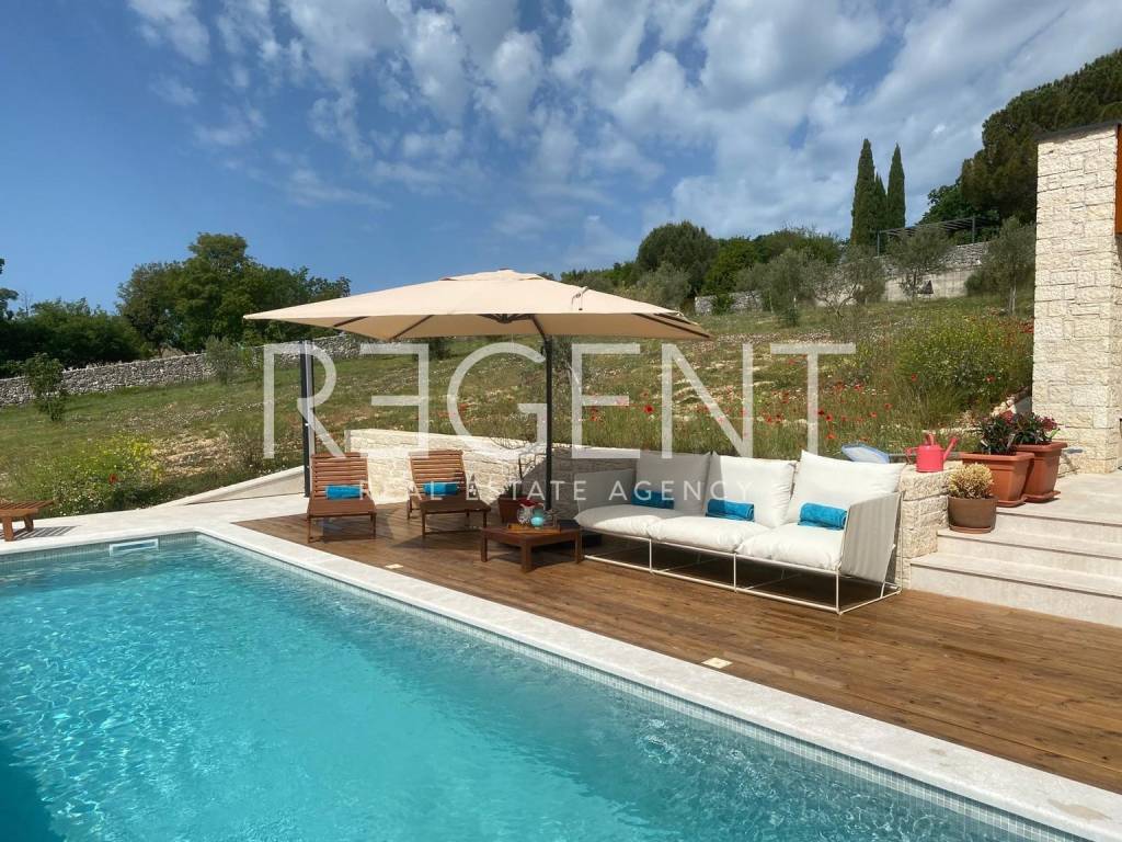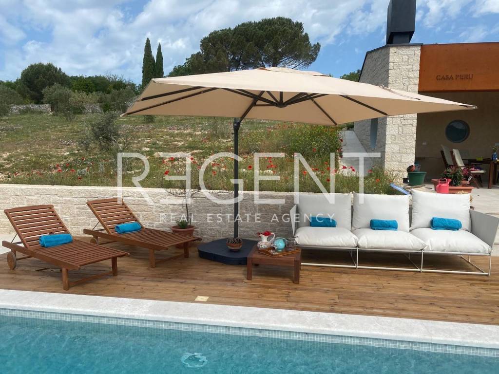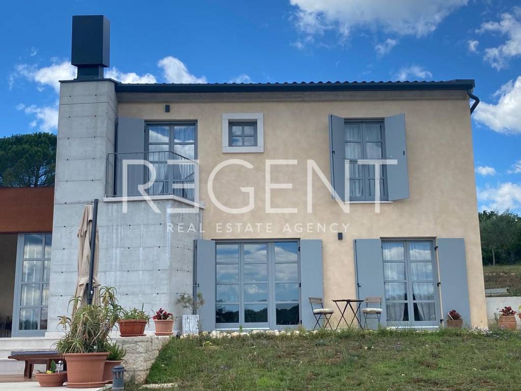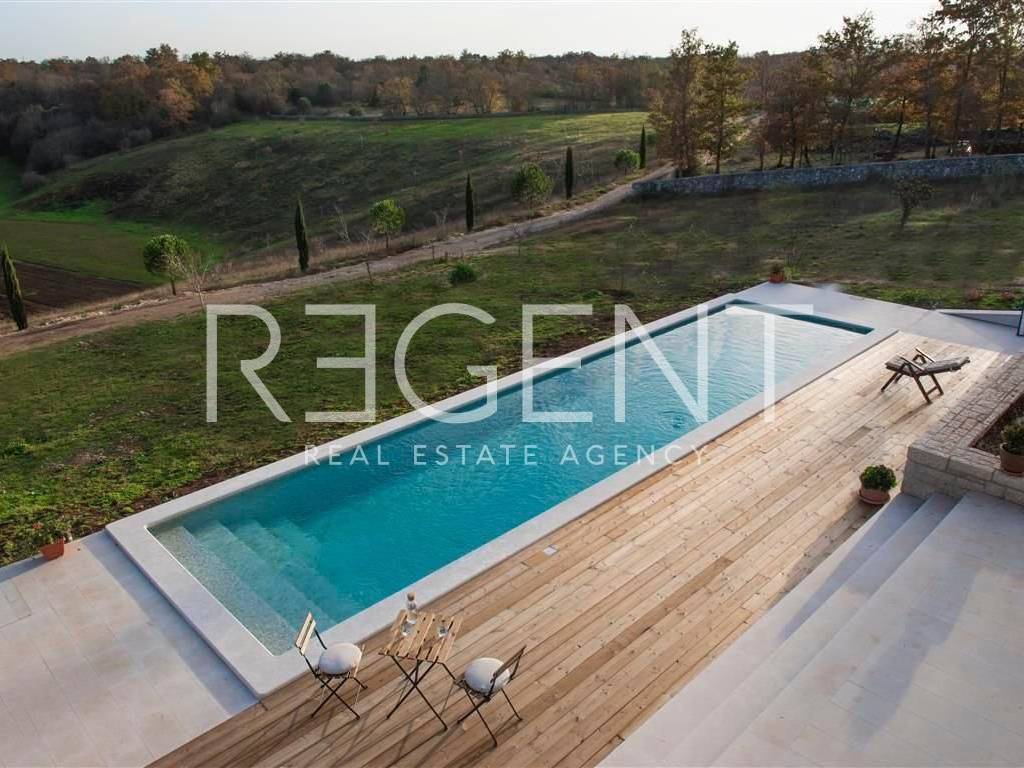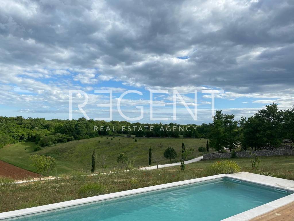 U predivnom prirodnom okruženju, ovo jedinstveno imanje od 36.000 m² nudi savršenu ravnotežu između luksuza, privatnosti i autentičnog istarskog šarma. Okruženo tradicionalnim suhozidima, ovo prostrano zemljište pruža idiličan bijeg od užurbanog života, dok istovremeno omogućuje vrhunski komfor. Glavna kamena kuća, smještena na imanju, prostire se na 155 m² NKP i savršeno spaja tradicionalnu arhitekturu s modernim rješenjima. Prilaz kući vodi bijeli put dug 300 metara, stvarajući dojam ekskluzivnosti i intime. Kuća se proteže na dvije etaže. U prizemlju se nalazi prostrani dnevni boravak s kaminom, povezan s kuhinjom i blagovaonicom u open space konceptu, zatim gostinjski toalet, spavaća soba s vlastitom kupaonicom, sauna te praonica rublja. Na katu su dvije prostrane spavaće sobe, svaka s privatnom kupaonicom i terasom s koje se pruža predivan pogled na okolni krajolik. Cjelokupni interijer odiše toplinom i udobnošću, uz vrhunsku opremu poput klimatizacijskog sustava, sigurnosnog nadzora i alarma. Vanjski prostor osmišljen je za potpuni užitak i opuštanje. Bazen od 50 m² s grijanjem i sustavom slane vode, natkrivena ljetna kuhinja te prostrano sunčalište idealni su za boravak na otvorenom. Maslinik s 50 stabala godišnje daje oko 230 kg ploda, dok raznolika mediteranska vegetacija dodatno obogaćuje ovaj poseban ambijent. Osim glavne parcele od 2.303 m², imanje uključuje i dvije građevinske parcele ukupne površine 6.193 m², za koje je već razrađeno idejno rješenje za dodatnu gradnju. Također, na raspolaganju je 26.000 m² poljoprivrednog zemljišta, pružajući budućem vlasniku raznolike mogućnosti – bilo za vlastiti užitak ili kao investicijski projekt s velikim potencijalom. Smješteno na mirnoj lokaciji, imanje nudi privatnost, ali i izvrsnu povezanost s ključnim sadržajima. Pula aerodrom je udaljena 33 km, dok su prekrasne plaže Limskog kanala na 6 km, a Rovinj na samo 10 km. Ova nekretnina predstavlja jedinstvenu priliku za one koji traže spoj luksuza, prirodnog ambijenta i investicijskog potencijala. Za više informacija i dogovor o razgledavanju, slobodno nas kontaktirajte!