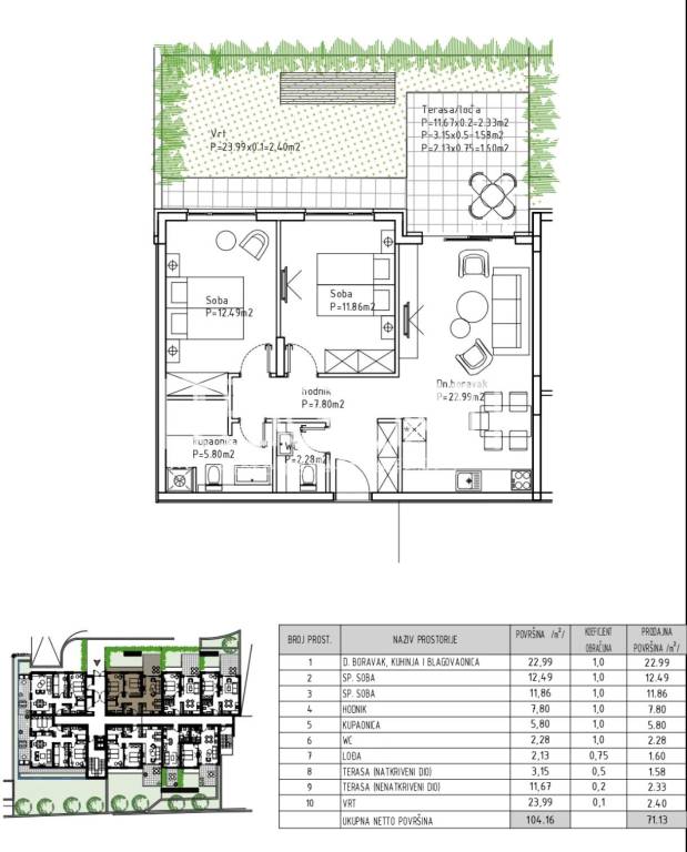 Posredujemo pri prodaji dvosobnog stana u novogradnji koji se nalazi u prekrasnoj Makarskoj. Stan se nalazi na izvrsnoj lokaciji, u blizini mora, trgovina i svih potrebnih sadržaja za svakodnevni život.Površina stana iznosi 71,13 m2 te se nalazi u prizemlju zgrade, a sastoji se od hodnika ukupne površine 7,80 m2, kupaonice ukupne površine 5,80, dodatnog wc-a ukupne površine 2,28 m2, dvi spavaće sobe ukupne površine 12,49 m2, 11,86 m2, dnevnog boravka i kuhinje s blagovaonicom ukupne površine 22,99 m2, loggia ukupne površine 1,60 m2, natkrivene terase 1,58 m2, nenatkrivene terase ukupne površine 2,33 m2 te vrt ukupne površine 2,40 m2.Stanu pripada i garažno parkirno mjesto koje nije uključeno u cijenu. Cijena garažnog mjesta na prvoj etaži je 25000 eura, dok je na drugoj etaži 22 500 eura.Zbog svoje orijentacije, ovaj je stan ispunjen prirodnom svjetlošću i pruža mogućnost uživanja u mediteranskom suncu na prostranoj terasi. Stan je u potpunosti klimatiziran, a kupaonice su pokrivene podnim grijanjem što mu pruža dodatnu udobnost i komfor.Ovaj je stan savršen spoj udobnosti i estetike, pružajući vam dom u kojem ćete se osjećati mirno i udobno, a zbog svoje lokacije, idealan je i za turistički najam.Doživite životopisnu atmosferu Makarske iz udobnosti ovog modernog i praktičnog prostora!