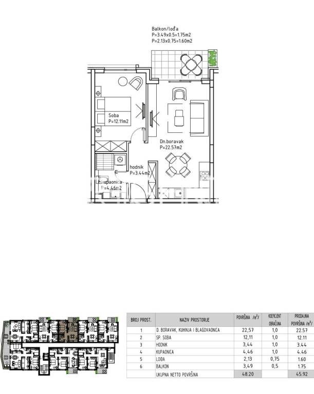 Posredujemo pri prodaji jednosobnog stana u novogradnji koji se nalazi u prekrasnoj Makarskoj. Stan se nalazi na izvrsnoj lokaciji, u blizini mora, trgovina i svih potrebnih sadržaja za svakodnevni život.Površina stana iznosi 45,92 m2 te se nalazi na drugom katu zgrade, a sastoji se od hodnika ukupne površine 3,44 m2, kupaonice ukupne površine 4,46, spavaće sobe ukupne površine 12,11 m2, dnevnog boravka, kuhinje s blagovaonicom ukupne površine 22,57 m2, loggia ukupne površine 1,60 m2 te balkon ukupne površine 1,75 m2.Stanu pripada i garažno parkirno mjesto koje nije uključeno u cijenu. Cijena garažnog mjesta na prvoj etaži je 25000 eura, dok je na drugoj etaži 22 500 eura.Zbog svoje orijentacije, ovaj je stan ispunjen prirodnom svjetlošću i pruža mogućnost uživanja u mediteranskom suncu na prostranoj terasi. Stan je u potpunosti klimatiziran, a kupaonice su pokrivene podnim grijanjem što mu pruža dodatnu udobnost i komfor.Ovaj je stan savršen spoj udobnosti i estetike, pružajući vam dom u kojem ćete se osjećati mirno i udobno, a zbog svoje lokacije, idealan je i za turistički najam.Doživite životopisnu atmosferu Makarske iz udobnosti ovog modernog i praktičnog prostora!