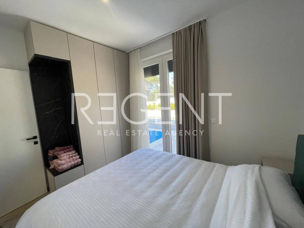 Posredujemo pri prodaji ove ekskluzivne vile s bazenom koja se nalazi na zemljištu od 350 m2. Ova prekrasna vila ima 181 m2 i sastoji se od prizemlja i prvog kata. U prizemlju se nalazi kuhinja sa blagavaonom, dnevni boravak, gostinjska soba, toalet i velika natkrivena terasa od 48 m2 pored koje se nalazi grijani bazen 7×4 m i ljetna kuhinja. Na prvi kat vode unutarnje stepenice gdje se nalazi galerija ili radni prostor, tri sobe svaka sa svojom kupaonicom i toaletom te natkrivena terasa s koje se pruža predivan pogled na more. Vila je građena po visokim standardima gradnje. Zidanje termo blokom, izolacija stiropor 8 cm, visoko kvalitetna aluminijska stolarija, visoko kvalitetne podne obloge, podno grijanje, na krovu izvedena instalacija za solarne panele, klimatizacija toshiba.Vila je izgrađena unutar projekta luksuzne dvojne vile sa bazenima u Bibinjama, te postoji mogućnost kupnje obiju vila, alio i odvojeno svaka vila zasebno.Bibinje je tradicionalno dalmatinsko mjesto smješteno na obali prekrasnog Jadranskog mora, nekoliko kilometara južno od Zadra. Bibinje se nalazi na srednjem Jadranu, a u Bibinjama se nalazi prekrasna marina Dalmacija, svega 800 metara od vile u ponudi, iz koje je idealno isploviti i istražiti Jadransko more i njegove otoke. Najveća luka za jahte Marina nalazi se samo 700 metara od ove vile, dok vas do mora i plaže dijeli samo 900 metara. Zračna luka Zemunik udaljena je 4 kilometra od nekretnine, trajektna luka 3 kilometra, dok vas od autoputa u Zadru dijeli samo 2 kilometra te kilometar i pol do autoputa u Sukošanu. Isto tako na svega sat vremena vožnje nalazi se nekoliko Nacionalnih parkova i Parkova prirode.Ova vila pruža sve pogodnosti za ugodan i aktivan odmor ili cjelogodišnji život sa svim potrebnim sadržajima u blizini.
