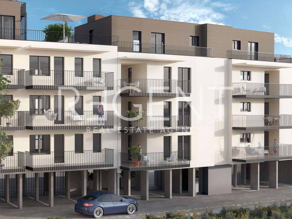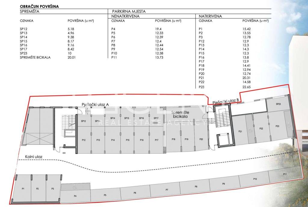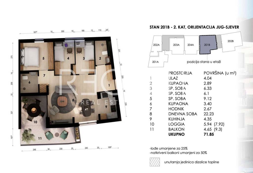 U mirnom okruženju zapadnog dijela Zagreba, u blizini Prilaza baruna Filipovića, na 2. katu suvremenog kompleksa koji se sastoji od 21 stambene jedinice raspoređene na 5 etaža, smjestio se ovaj moderan četverosoban stan neto korisne površine 71,85 m². Ova stambena jedinica dvostrano je orijentirana (SJEVER-JUG), pružajući ugodan ambijent s pogledom prema visokom zelenilu. Stan se sastoji od: Ulaznog prostora (4,04m2) Hodnika (2,67 m2) Dnevnog boravka s blagovaonicom (22,23 m2) Kuhinje (4,35 m2) Tri spavaće sobe (9,12 m2, 6,33 m2 i 6,10 m2) Dvije kupaonice (3,40 m2 i 2,89 m2) Balkona (4,65 m2) Loggie (5,94 m2). Oprema i kvaliteta: Grijanje: podno grijanje i velikoformatna keramika te sustav grijanja preko dizalice topline Stolarija: PVC troslojna stolarija s roletama na elektromotore Podne obloge: parket prve klase + keramičke pločice Sanitarije: sanitarije renomiranih proizvođača (Grohe, Laufen, Duravit, Ideal Standard, Drvo Bjelovar, Aquastil, Daikin, Kolnoa, HikVision) Ostalo: master prekidač za svjetla, termostati povezivi s mobitelom, portafon poveziv s mobitelom, grijanje i hlađenje upravljanje s mobitelom, lift poveziv s mobitelom. Sama konstrukcija zgrade je armirano betonska na temeljnoj AB ploči te su svi AB zidovi debljine 20 cm dok je fasada debljine 16 cm u ETICS sustavu. Stan se nalazi u energetski učinkovitoj zgradi nZEB standarda te ima i pripremu za punjenje električnih automobila na svakom parkirnom mjestu te veliko zajedničko spremište za bicikle. Vertikalna komunikacija ostvarena je s dva stubišta i dva dizala. Zajednički prostori i parking su pod 24h videonadzorom čime je osigurana maksimalna sigurnost. U sklopu projekta nalazi se 25 parkirnih mjesta od kojih je dio natkriven. Lokacija stana izuzetno je pogodna: 110 metara do vrtića 300 metara do osnovne škole 350 metara do autobusne stanice 900 metara do tramvajske stanice 5 minuta do vlaka 1,6 km do bolnice 6 km do zelene površine. Cijene parkirnih mjesta: Natkriveno parkirno mjesto (P1 – P3): 1650 €/m² Nenatkriveno parkirno mjesto (P4 – P11): 1350 €/m² Natkriveno parkirno mjesto sa spremištem (P12 – P17, P23): 1650 €/m² Natkriveno parkirno mjesto (P18 – P22): 1600 €/m². Projekt nudi visoku energetsku učinkovitost, modernu opremu, ekološku održivost i sigurnost, idealan je za obitelji i parove koji traže komforan život u mirnom urbanom okruženju. Planiran završetak: ožujak 2026. godine. Za više informacija ili razgledavanje stana, slobodno nas kontaktirajte!