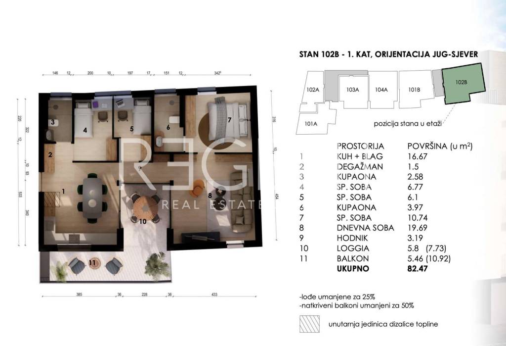 U mirnom okruženju zapadnog dijela Zagreba, u blizini Prilaza baruna Filipovića, na 1. katu suvremenog kompleksa koji se sastoji od 21 stambene jedinice raspoređene na 5 etaža, smjestio se ovaj moderan četverosoban stan neto korisne površine 82,47 m². Ova stambena jedinica dvostrano je orijentirana (SJEVER-JUG), pružajući ugodan ambijent s pogledom prema visokom zelenilu. Stan se sastoji od: Hodnika (3,19 m2) Degažmana (1,50 m2) Dnevnog boravka (19,69 m2) Kuhinje + blagovaonice (16,67 m2) Tri spavaće sobe (10,74 m2, 6,77 m2 i 6,10 m2) Dvije kupaonice (3,97 m2 i 2,58 m2) Balkona (5,46 m2) Loggie (5,80 m2). Oprema i kvaliteta: Grijanje: podno grijanje i velikoformatna keramika te sustav grijanja preko dizalice topline Stolarija: PVC troslojna stolarija s roletama na elektromotore Podne obloge: parket prve klase + keramičke pločice Sanitarije: sanitarije renomiranih proizvođača (Grohe, Laufen, Duravit, Ideal Standard, Drvo Bjelovar, Aquastil, Daikin, Kolnoa, HikVision) Ostalo: master prekidač za svjetla, termostati povezivi s mobitelom, portafon poveziv s mobitelom, grijanje i hlađenje upravljanje s mobitelom, lift poveziv s mobitelom. Sama konstrukcija zgrade je armirano betonska na temeljnoj AB ploči te su svi AB zidovi debljine 20 cm dok je fasada debljine 16 cm u ETICS sustavu. Stan se nalazi u energetski učinkovitoj zgradi nZEB standarda te ima i pripremu za punjenje električnih automobila na svakom parkirnom mjestu te veliko zajedničko spremište za bicikle. Vertikalna komunikacija ostvarena je s dva stubišta i dva dizala. Zajednički prostori i parking su pod 24h videonadzorom čime je osigurana maksimalna sigurnost. U sklopu projekta nalazi se 25 parkirnih mjesta od kojih je dio natkriven. Lokacija stana izuzetno je pogodna: 110 metara do vrtića 300 metara do osnovne škole 350 metara do autobusne stanice 900 metara do tramvajske stanice 5 minuta do vlaka 1,6 km do bolnice 6 km do zelene površine. Cijene parkirnih mjesta: Natkriveno parkirno mjesto (P1 – P3): 1650 €/m² Nenatkriveno parkirno mjesto (P4 – P11): 1350 €/m² Natkriveno parkirno mjesto sa spremištem (P12 – P17, P23): 1650 €/m² Natkriveno parkirno mjesto (P18 – P22): 1600 €/m². Projekt nudi visoku energetsku učinkovitost, modernu opremu, ekološku održivost i sigurnost, idealan je za obitelji i parove koji traže komforan život u mirnom urbanom okruženju. Planiran završetak: ožujak 2026. godine. Za više informacija ili razgledavanje stana, slobodno nas kontaktirajte!