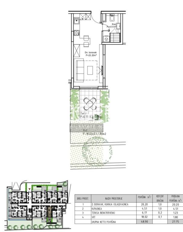 Posredujemo pri prodaji garsonjere u novogradnji koja se nalazi u prekrasnoj Makarskoj. Stan se nalazi na izvrsnoj lokaciji, u blizini mora, trgovina i svih potrebnih sadržaja za svakodnevni život.Površina stana iznosi 27,74 m2 te se nalazi u prizemlju zgrade, a sastoji se od kupaonice ukupne površine 4,51, dnevnog boravka i kuhinje s blagovaonicom ukupne površine 20,20 m2, nenatkrivene terase ukupne površine 1,23 m2 te vrt ukupne površine 1,80 m2.Stanu pripada i garažno parkirno mjesto koje nije uključeno u cijenu. Cijena garažnog mjesta na prvoj etaži je 25000 eura, dok je na drugoj etaži 22 500 eura.Zbog svoje orijentacije, ovaj je stan ispunjen prirodnom svjetlošću i pruža mogućnost uživanja u mediteranskom suncu na prostranoj terasi. Stan je u potpunosti klimatiziran, a kupaonice su pokrivene podnim grijanjem što mu pruža dodatnu udobnost i komfor.Ovaj je stan savršen spoj udobnosti i estetike, pružajući vam dom u kojem ćete se osjećati mirno i udobno, a zbog svoje lokacije, idealan je i za turistički najam.Doživite životopisnu atmosferu Makarske iz iz udobnosti ovog modernog i praktičnog prostora!