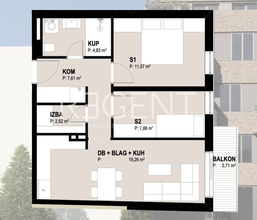 Na odličnoj lokaciji u mirnom dijelu Trešnjevke, u blizini vrtića, osnovne i srednje škole, autobusnih linija povezanih s Črnomercem, željezničke stanice, crkve, trgovačkih centara i ostalih sadržaja potrebnih za ugodan život, nalazi se novi stambeni projekt u izgradnji s planiranim useljenjem na prvi kvartal 2026. godine. Stan ukupne površine 57,89 m² nalazi se u visokom prizemlju zgrade s liftom, s iznimno funkcionalnim rasporedom. Sastoji se od prostranog dnevnog boravka s blagovaonicom i kuhinjom (19,26 m²), dvi spavaće sobe (11,57 m² i 7,88 m²), kupaonice (4,83 m²), izbom (2,52 m²), hodnika (7,61 m²), balkona (3,71 m²) i spremišta (4,72 m²) u podrumu. Mogućnost kupovine vanjskog parkirnog mjesta i/ili garaže uz nadoplatu. Zgrada je građena prema najvišim standardima energetske učinkovitosti (A certifikat). Investitor koristi vrhunske materijale: PVC stolariju s troslojnim staklom punjenim argonom, protuprovalna i protupožarna vrata, hrastov klasičan parket, keramiku 1. klase i protuklizne pločice na terasama. Grijanje i hlađenje osigurava dizalica topline uz podno grijanje, a sve instalacije (struja, voda, plin) su odvojene. Stanovi su opremljeni kondenzacijskim bojlerom, bešumnom ventilacijom, komarnicima, optičkim kabelom i klimatizacijom. Stan je tlocrtno promišljeno koncipiran, s naglaskom na funkcionalnost, prozračnost i obilje prirodnog svjetla. Za više informacija i dogovor oko razgledavanja, slobodno nas kontaktirajte!