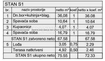 Prodaje se stan u prizemlju novogradnje, površine 86 m². Sastoji se od dvije spavaće sobe, dnevnog boravka s kuhinjom i blagovaonicom te moderno uređene kupaonice. Stan ima podno grijanje i klima uređaj, što pruža visoku razinu udobnosti tijekom cijele godine. Posebnu vrijednost daje vrt od 84 m², idealan za opuštanje i privatnost.