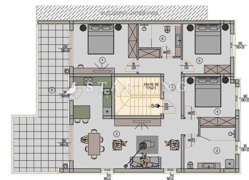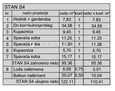 Prodaje se stan na drugom katu novogradnje, površine 115 m². Sastoji se od tri spavaće sobe, dnevnog boravka s kuhinjom i blagovaonicom te dvije moderno uređene kupaonice. Master spavaća soba ima vlastitu kupaonicu. Posebnu vrijednost daje prostrana terasa, idealna za boravak na otvorenom.