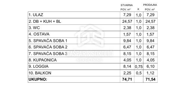 Stan se sastoji od ulaznog prostora, prostranog dnevnog boravka s kuhinjom i blagovaonicom, tri udobne spavaće sobe, hodnika, kupaonice, odvojenog WC-a, ostave, balkona i loggie koja pruža dodatni prostor za opuštanje ili uživanje na svježem zraku.