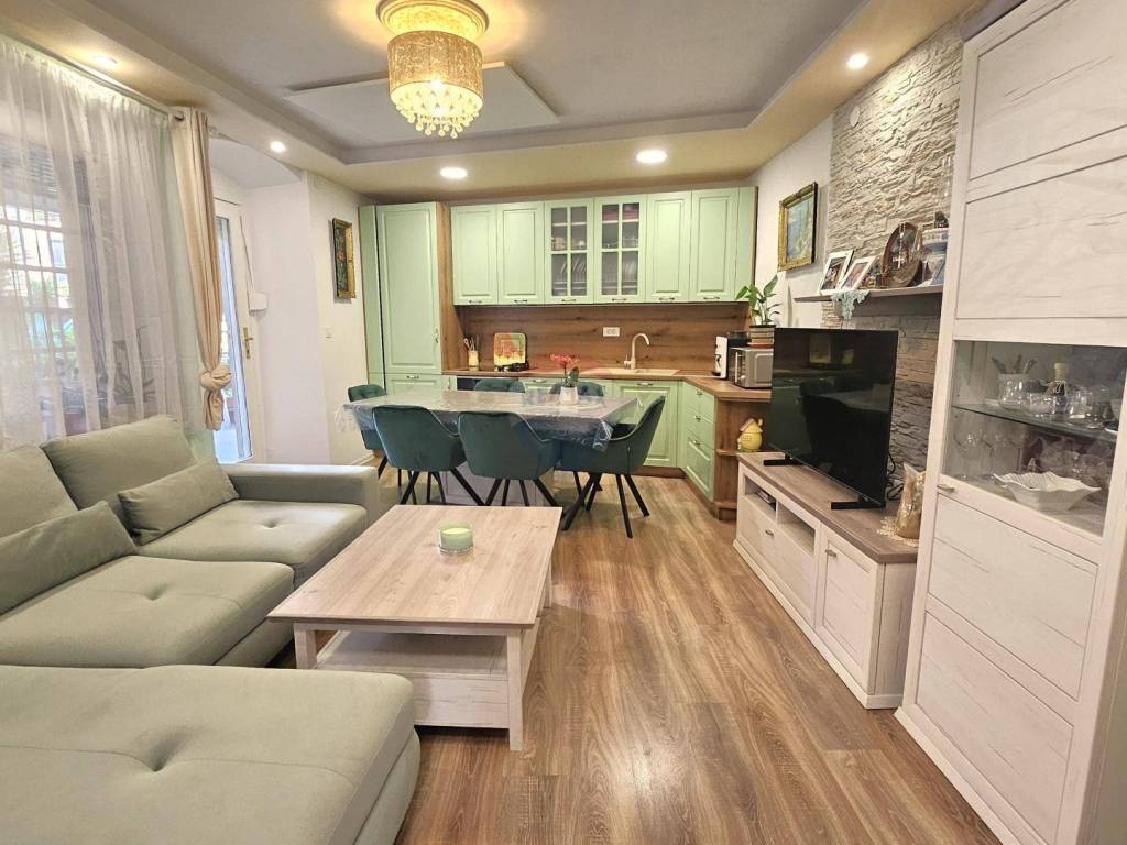 Renovacija stana izvedena je vrlo kvalitetno, s pažnjom posvećenom svakom detalju. Stan je opremljen izvrsnim modernim namještajem od punog drveta, koji dodaje dozu luksuza i udobnosti. U stanu je postavljeno podno grijanje i klima uređaj, dok su na stropu postavljeni eko paneli, osiguravajući toplinu i ugodnost tijekom cijele godine.