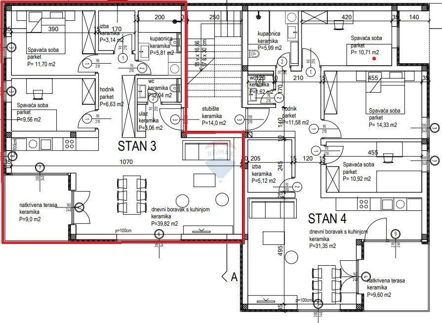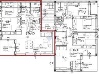 Dvosobni je stan lociran na 1. katu, broji ukupno 90,76m2 a sastoji se od: