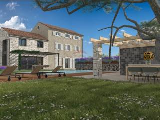 Kompletna parcela je omeđena novim kamenim zidom, u dvorištu su predviđeni bazen, ljetna kuhinja/vanjski prostor, a tu je i pomoćna zgrada od 50 m2.