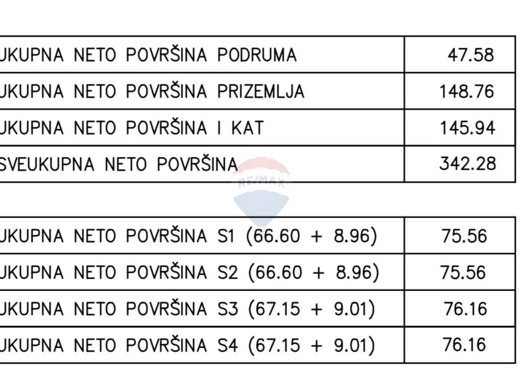Stan je neto korisne površine 67.15 m2 a pripada mu i ostava u podrumu zgrade neto površine 9 m2 i parkirno mjesto 3.12m2 što iznosi sveukupno 79.28 m2,reducirane površine.