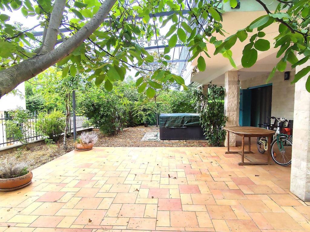Dvorište je opremljeno vanjskim kaminom i jacuzziem, a vrt je ozelenjen s ugrađenim automatskim navodnjavanjem za travu i biljke.