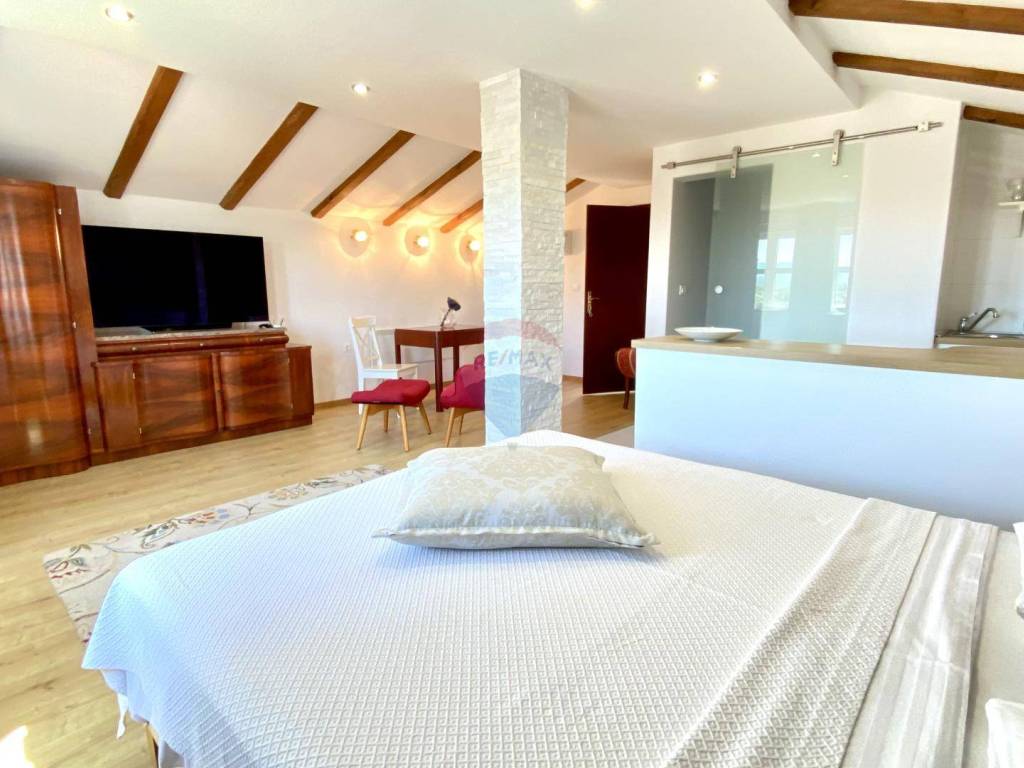 Kuća se sastoji se od devet kategoriziranih apartmana jednosobnih, dvosobnih te studio koji su elegantno namješteni namještajem po mjeri što dodatno doprinosi eleganciji te su opremljeni svim potrebnim sadržajima za udoban boravak i kao takvi se prodaju.Tu su i dva prostrana salona u samom prizemlju sa izlazom na bazen koji pružaju dovoljno prostora za druženje i opuštanje. Od dodatnih prostorija tu su garaža za dva automobila, više spremišta te kotlovnica.