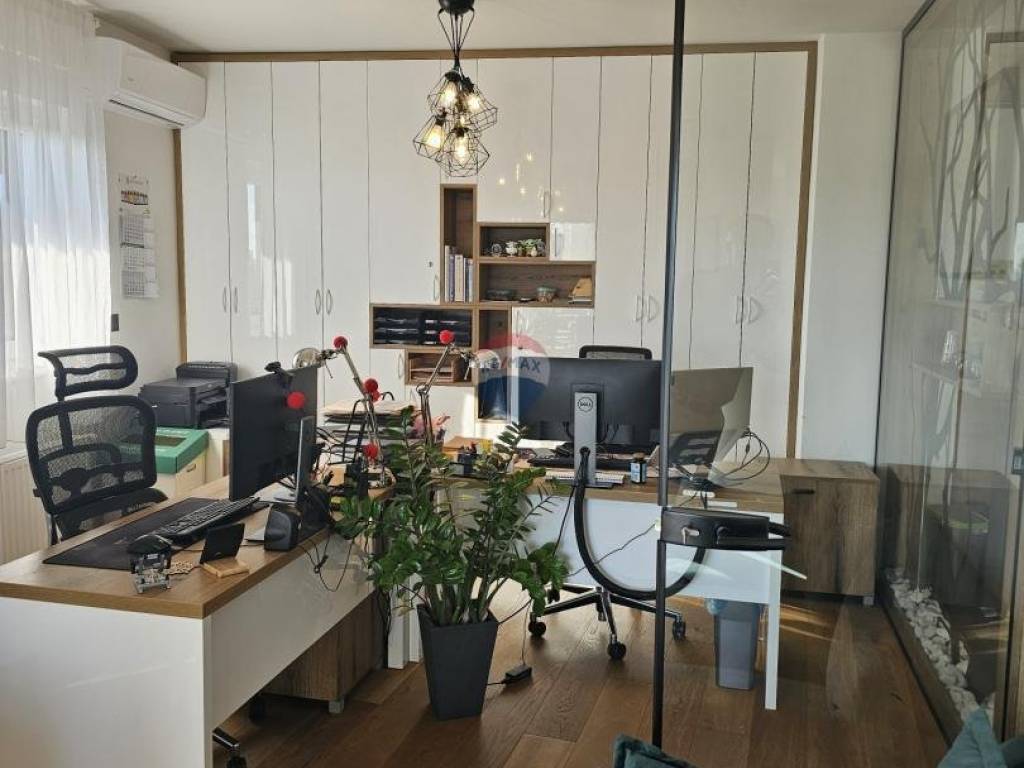 Sastoji se od tri odvojene uredske prostorije, kuhinje, toaleta, prostranog balkona s kojeg se pruža predivan pogled te se uz prostor, uz nadoplatu, iznajmljuje jedno garažno parkirno mjesto.