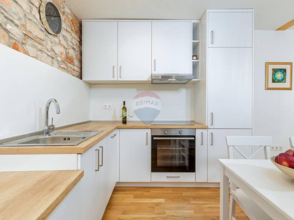 Dvoetažni stan na katu sastoji se od dnevnog boravka, kuhinje, blagovaonice, toaleta, dvije spavaće sobe i kupatila.